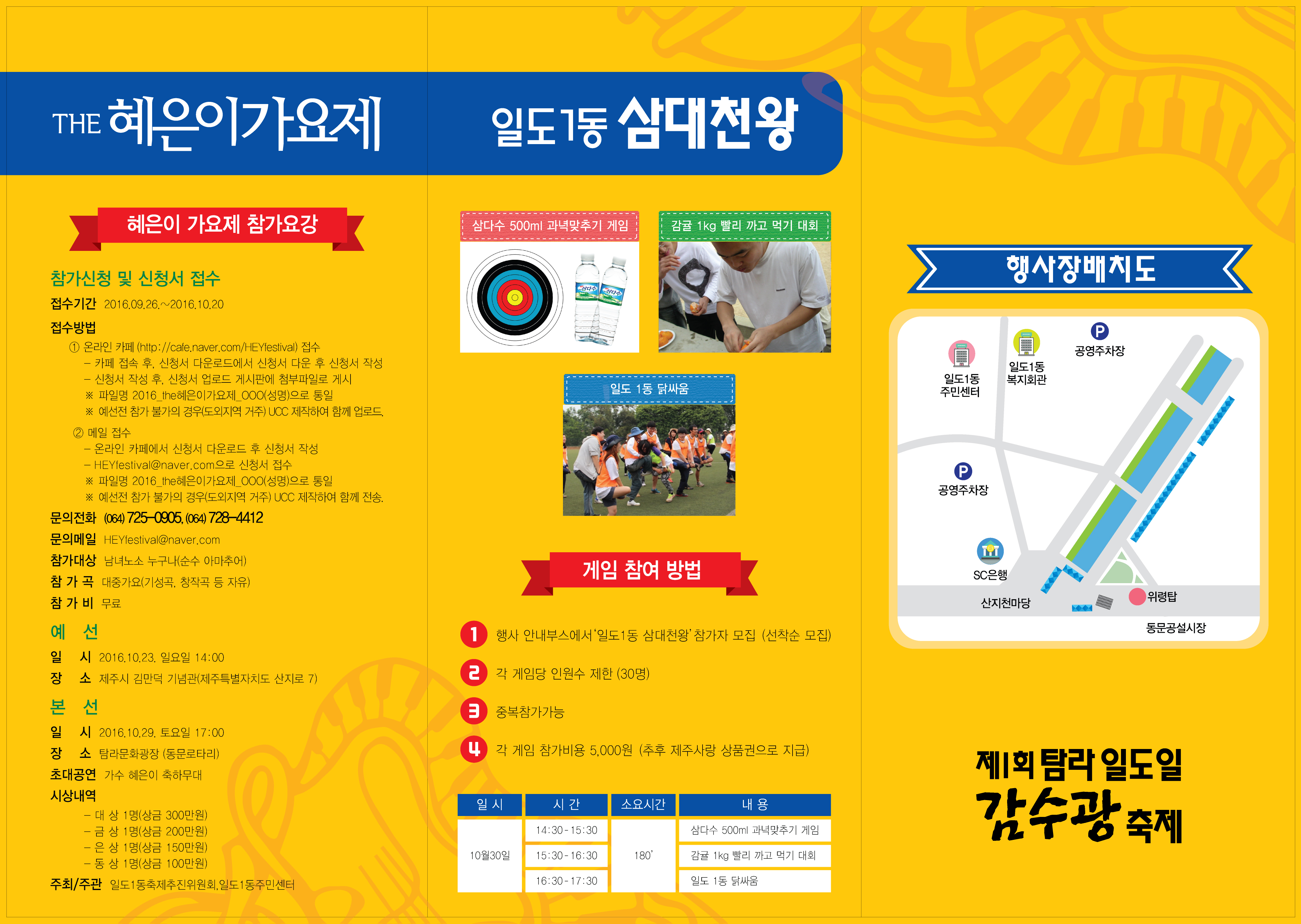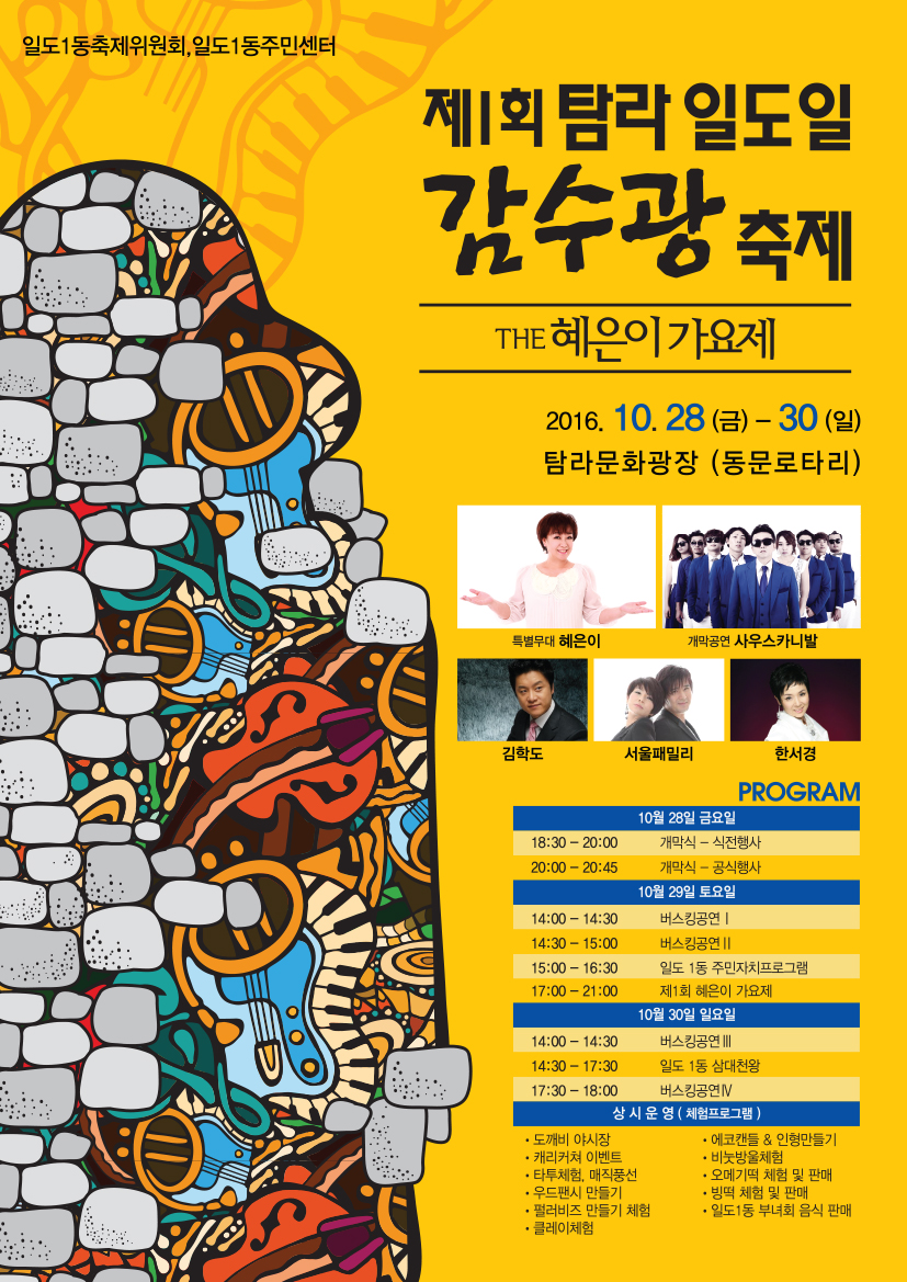 - 제주의 원도심권 금융, 쇼핑의 중심지인 산지천광장 일대에서 일도1동 과거의 기억 및 자료를 토대로 현대적 디지털 플랫폼을 가미한 제1회 탐라일도일감수광축제를 2016년 10월 28일부터 30일까지 3일간 개최할 예정입니다.