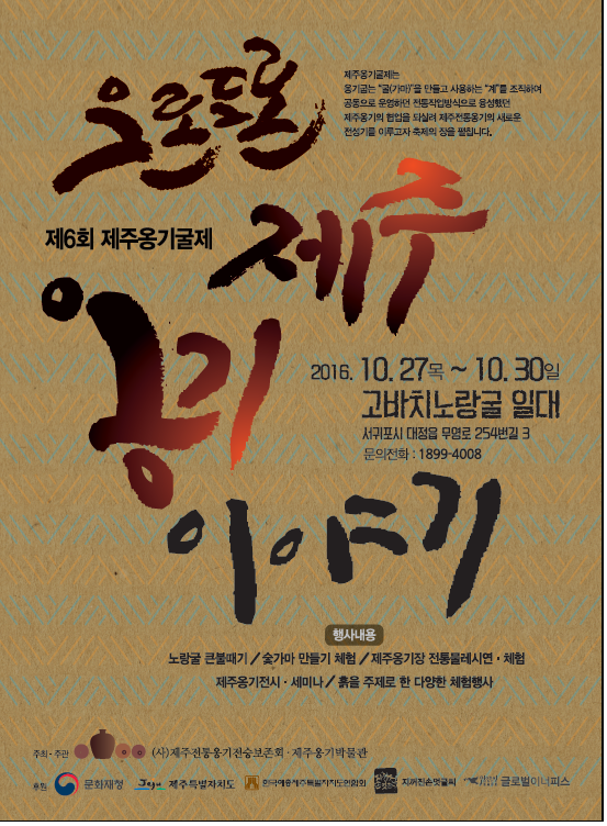 행사내용 : 노랑굴 큰불때기, 숯가마 만들기 체험, 제주옹기장 전통물레 시연 및 체험, 제주옹기전시 및 세미나, 흙을 주제로 한 다양한 체험행사