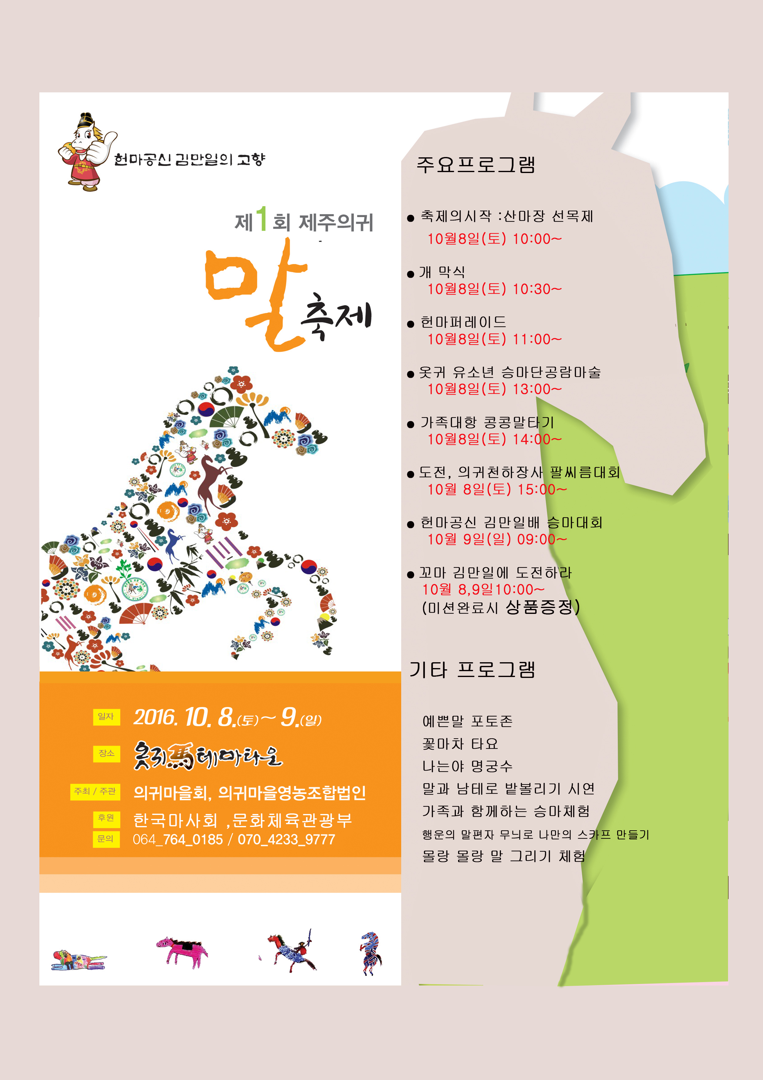 이번축제로 의귀리 에서는 그의 이야기를 담은 ‘의귀사람 김만일의 헌마퍼레이드’를 시작으로 제주말의 전통문화를 재현하고 가족과 함께하는승마체험, 공람마술, 가족대항 콩콩말타기, 예쁜말 포토존등 다양한 체험과 볼거리를 준비 했습니다