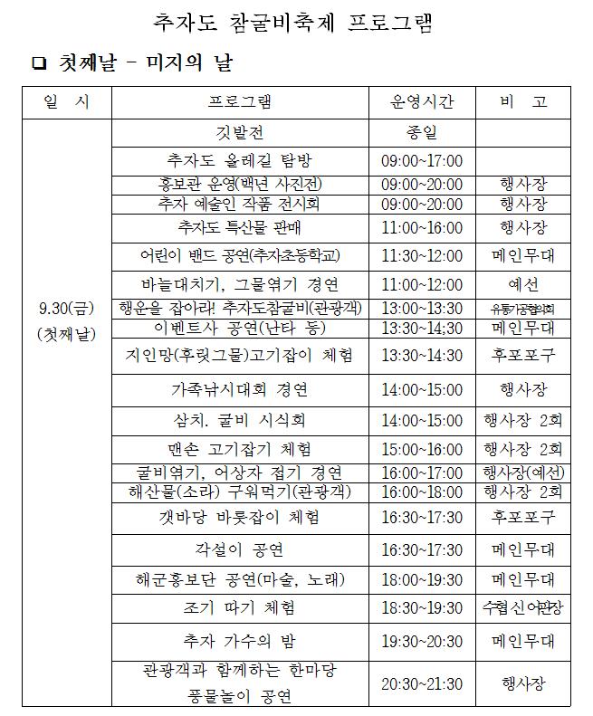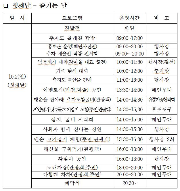 ○ 공연프로그램 : 축하공연, 각설이 공연, 추자풍물공연 등