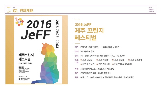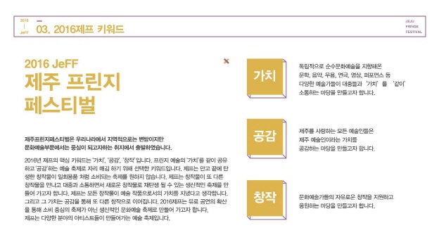 2016 제프의 핵심 키워드는 ‘가치’, ‘공감’, ‘창작’입니다. 프린지 예술의 ‘가치’를 같이 공유하고 ‘공감’하는 예술 축제로 자리매김하기 위해 선택한 키워드입니다. 제프는 만고 끝에 탄생한 창작물이 일회용품처럼 소비되는 축제를 원하지 않습니다. 제프는 창작물이 또 다른 창작물을 만나고 대중과 소통하면서 새로운 창작물로 재탄생될 수 있는 생산적인 축제를 만들어 가고자 합니다. 제프는 모든 창작물이 예술 작품으로서의 가치를 지녔다고 생각합니다. 그리고 그 가치는 공감을 통해 또 다른 창작으로 이어집니다. 2016제프는 유료 공연의 확산을 통해 소비 중심의 축제가 아닌 생산적인 문화예술 축제로 만들어 가고자 합니다.