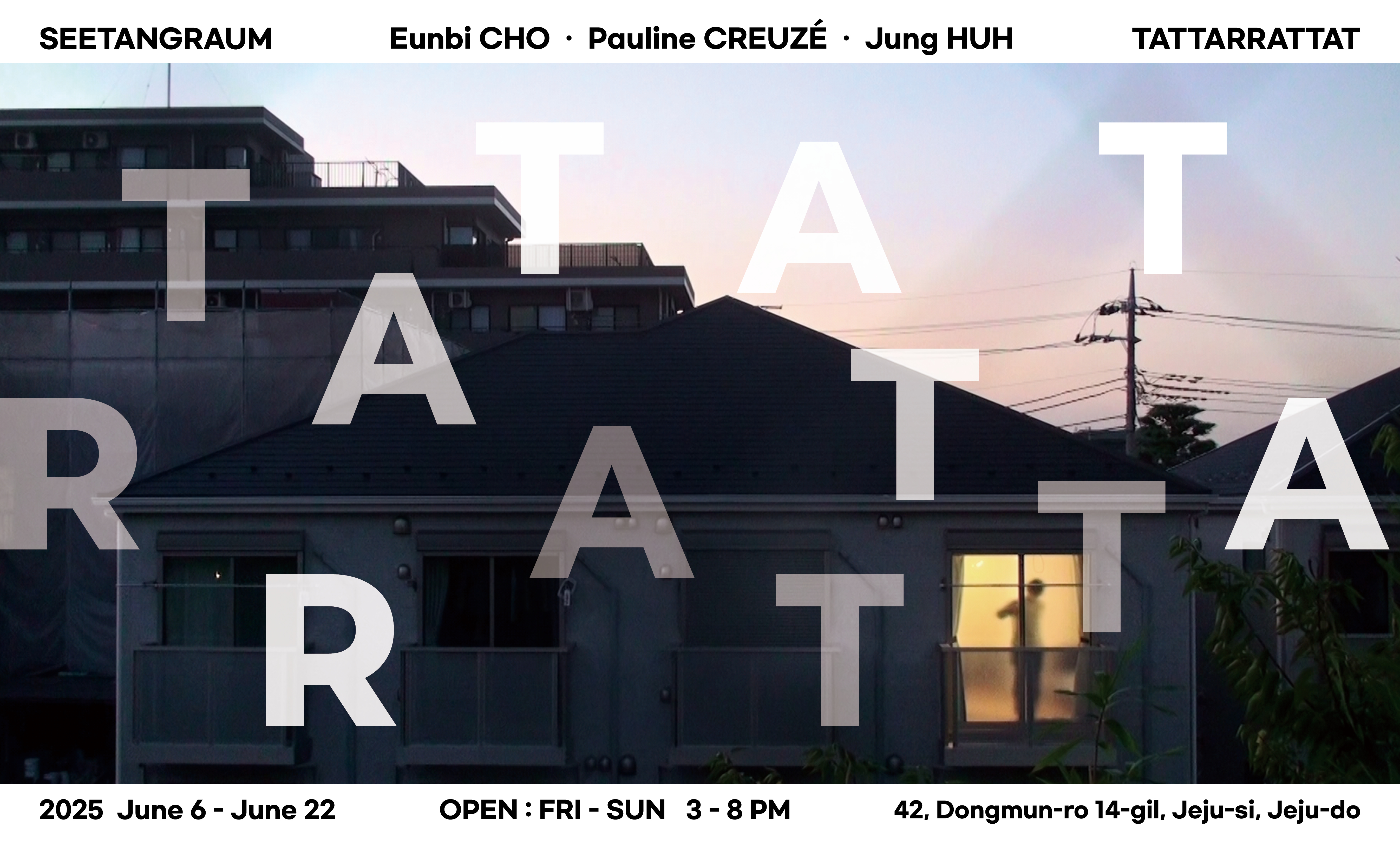 타타라타트(Tattarrattat)는 제임스 조이스의 『율리시스』 18장 Penelope에 등장하는 단어로, 주인공 블룸이 부엌 문을 두드릴 때 나는 소리를 묘사한 의성어입니다. 반복적이고 기계적인 일상 속에서도 울림은 존재의 흔들림을 암시하며, 리듬과 시간의 흔적으로 기록됩니다. 이번 전시는 두드림과 응답, 기다림과 반복을 모티프로, 사운드, 이미지, 물성, 텍스트의 경계를 탐색합니다.