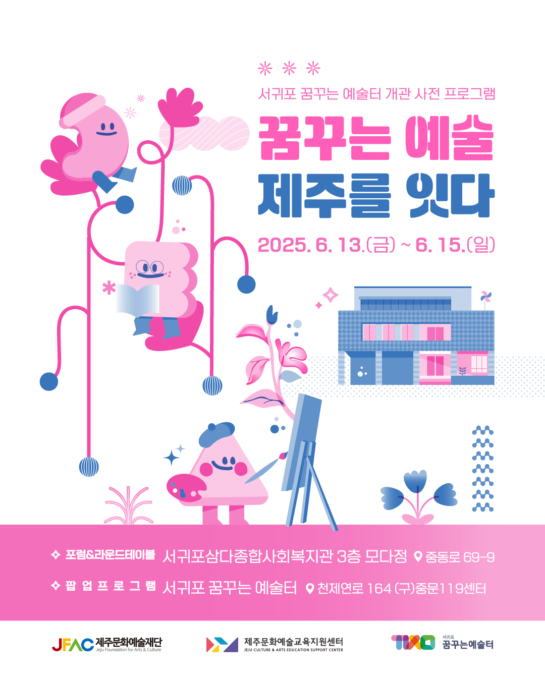 예술적 경험을 통해 지역의 문화와 사람을 연결하는 문화예술교육의 가치와 2025년 도내 최초 문화예술교육 전용공간 서귀포 꿈꾸는 예술터의 새로운 시작과 도약을 알리는 서귀포 꿈꾸는 예술터 개관 사전 프로그램 <꿈꾸는 예술, 제주를 잇다>에 초대합니다.