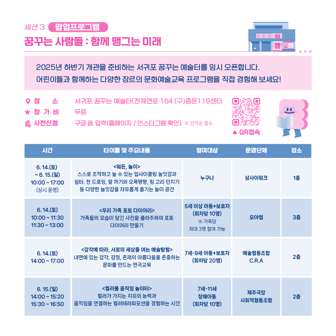 ? 2025년 하반기 개관을 준비하는 서귀포 꿈꾸는 예술터를 임시 오픈합니다. 어린이들과 함께하는 다양한 장르의 문화예술교육 프로그램을 직접 경험해 보세요!