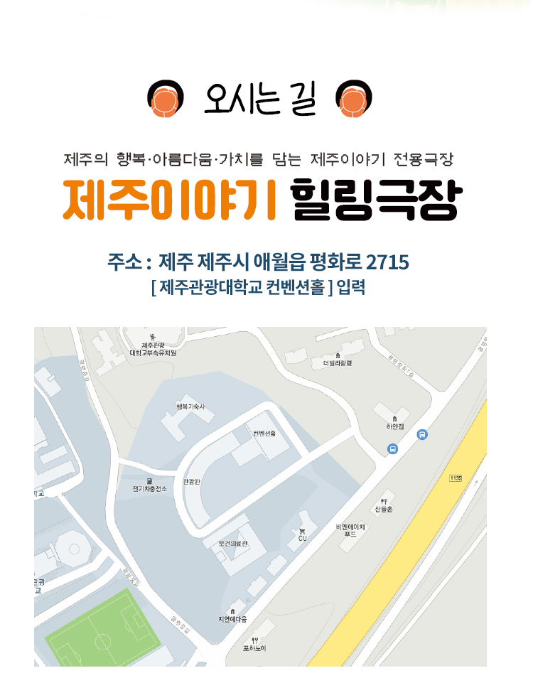 - 주소 (63063) 제주특별자치도 제주시 애월읍 평화로 2715 제주이야기 힐링극장 (제주관광대학교 컨벤션 홀)