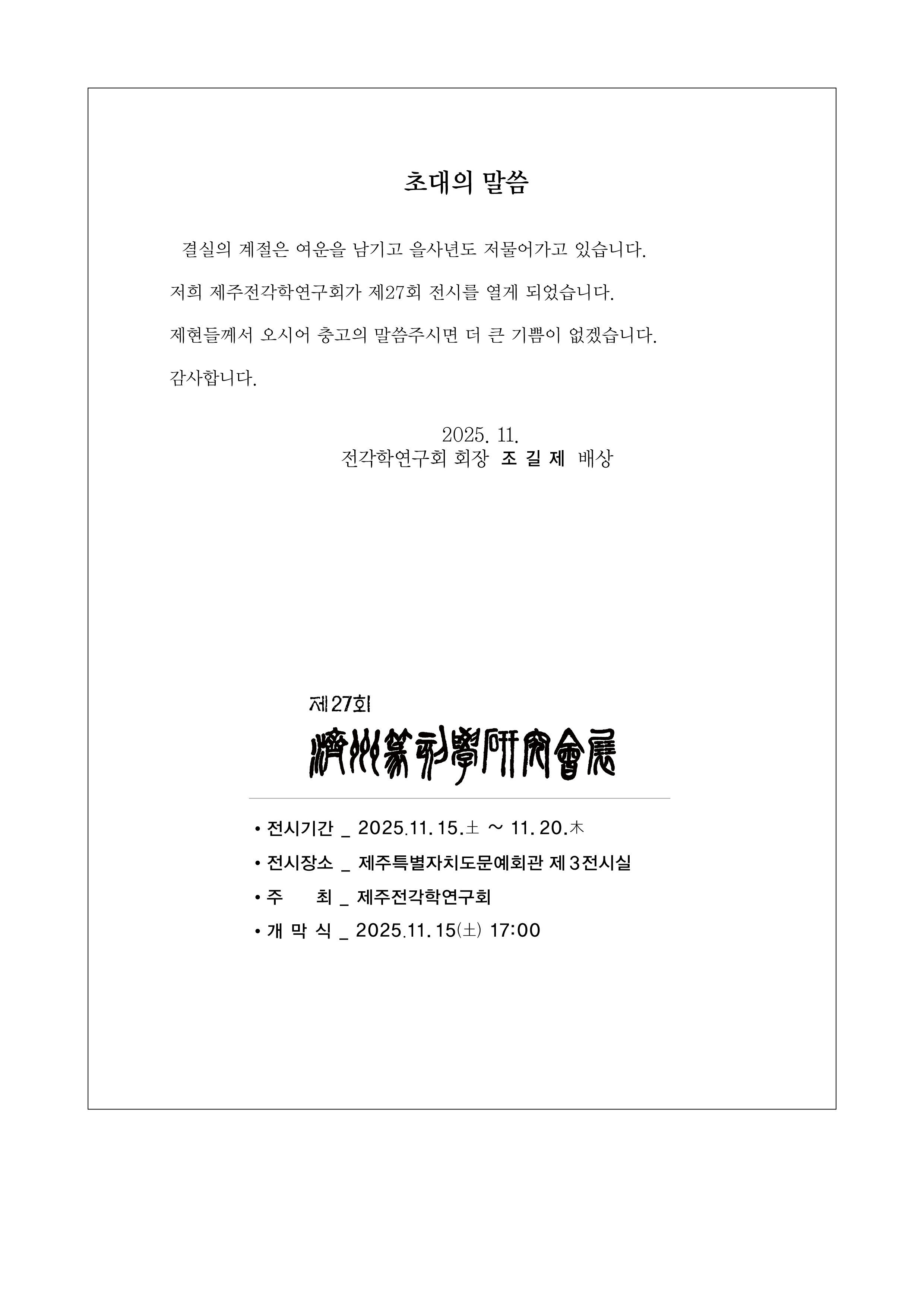 전각예술로 친숙한 문구와 전각의 다양한 활용 가능성을제시함으로써 대중과 쉽게 소통하고, 더 나아가 세계적인 조형문자로서의 지위를 보여주고자 한다. 또한 제주 지역의 문화예술 창작 역량을 강화하고 척박한 자연환경과 역사적 아픔 속에서도 굳건히 삶을 지켜온 우리 제주인의 삶의 애환을 작품 속에 담아 함께 나누는 자리를 마련하고자 한다.