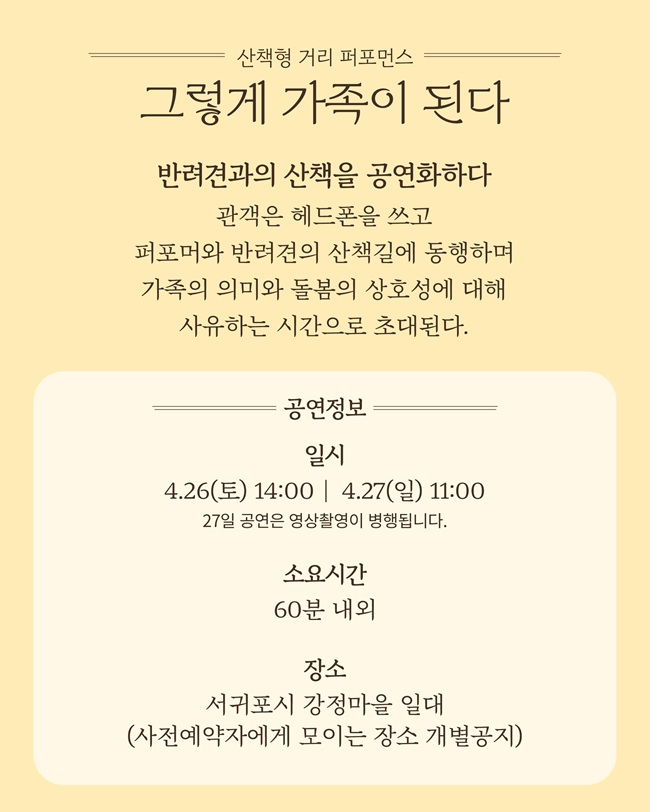 그렇게 가족이 된다는 산책형 거리 퍼포먼스 공연으로 관객은 헤드폰을 쓰고 퍼포머와 반려견의 산책길에 동행하며 가족의 의미와 돌봄의 상호성에 대해 사유하는 시간으로 초대됩니다.