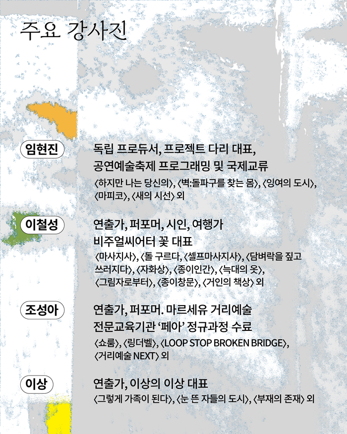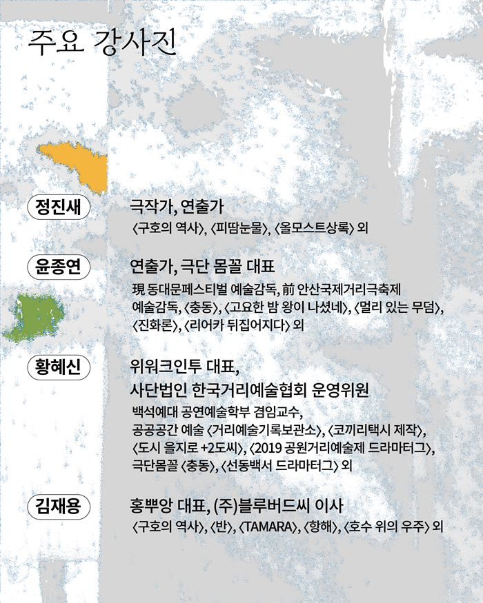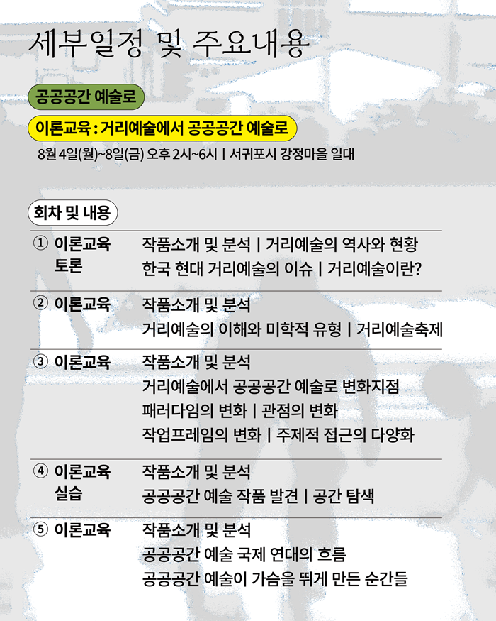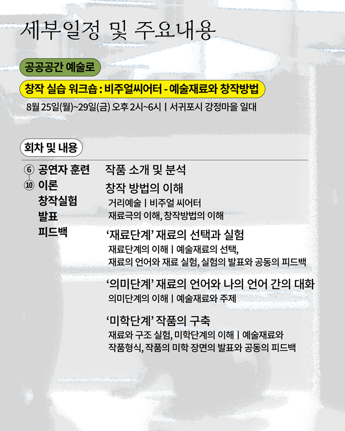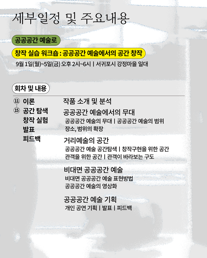 약 두 달의 시간 동안 공공공간 예술 이론교육, 창작실습 워크숍, 공동창작 워크숍 프로그램에 참여하며 공공공간 예술 분야 전문인력으로 성장하고, 창작역량을 강화할 수 있는 프로그램에 제주 지역 예술인들을 초대합니다.