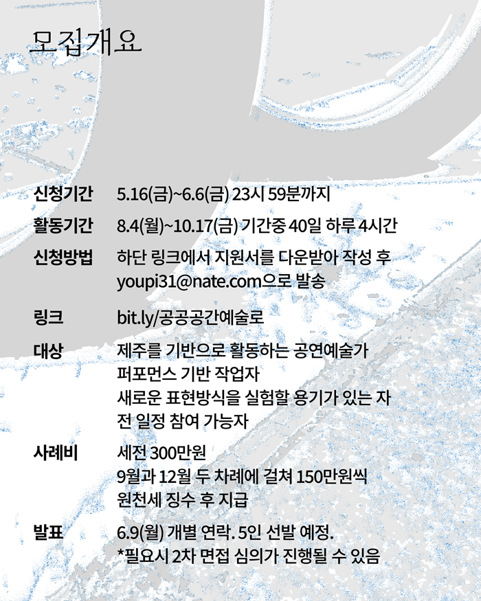 ✔️참여대상: 제주를 기반으로 활동하는 공연예술가, 퍼포먼스 기반 작업자, 새로운 표현방식을 실험할 용기가 있는 자, 전 일정 참여 가능자 (5인 선발 예정)