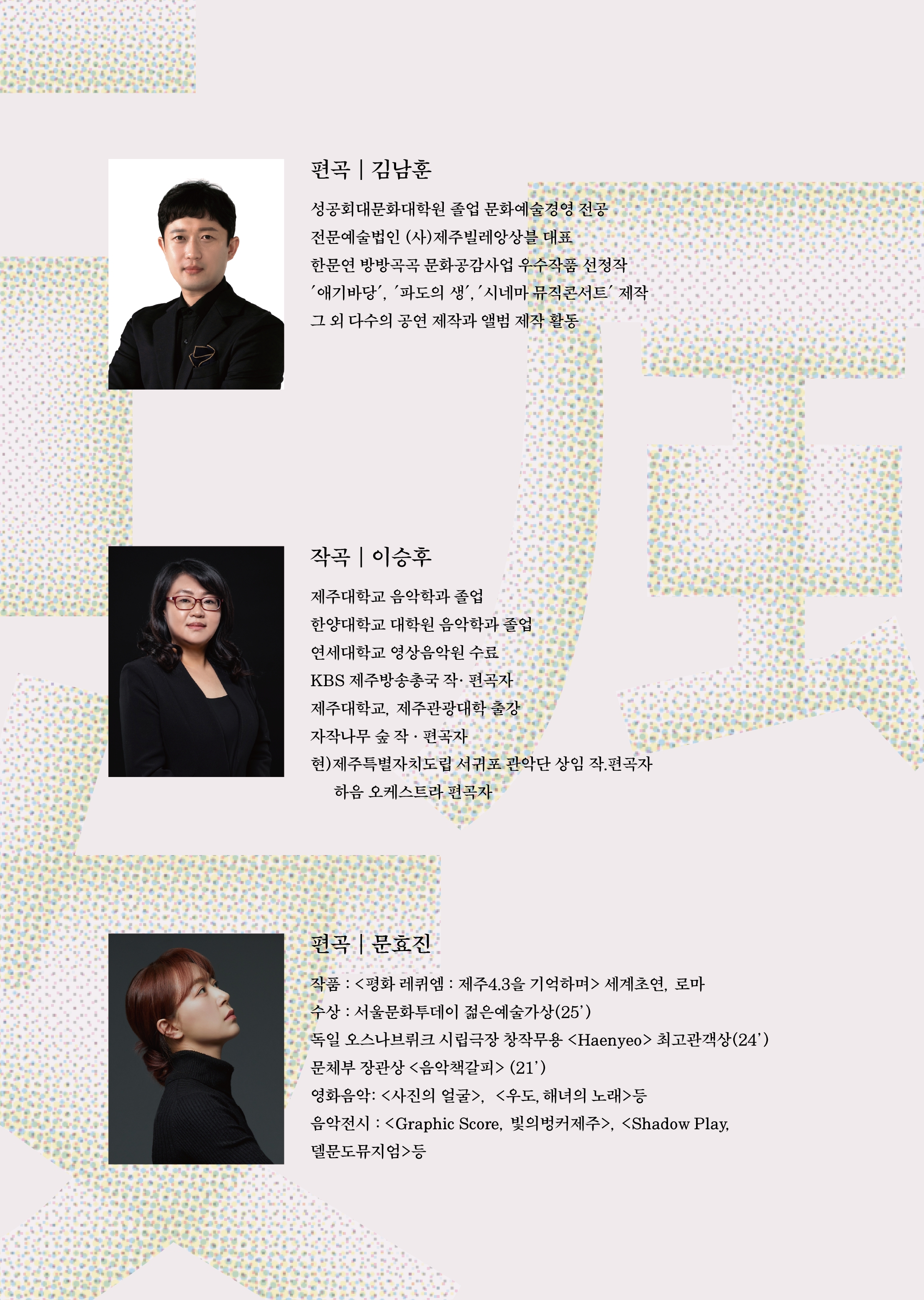● 현악 오케스트라의 깊고 풍성한 사운드로 제주의 다채로운 이야기를 펼쳐냅니다. 친숙한 제주 가요의 향수 어린 선율, 제주 겨울의 강렬한 정서를 담아낸 창작곡, 제주 민요의 현대적 재탄생, 그리고 제주의 상징 ‘돌, 바람, 여자’를 입체적으로 표현한 웅장한 초연 창작곡까지! 오직 제주체임버오케스트라만이 들려줄 수 있는 특별하고 풍성한 프로그램이 여러분의 마음을 사로잡을 것입니다.