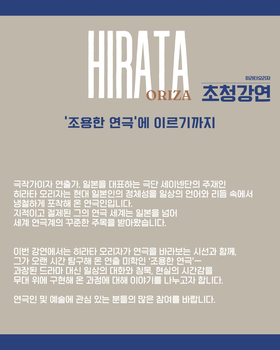 이번 강연에서는 히라타 오리자가 연극을 바라보는 시선과 함께, 그가 오랜 시간 탐구해 온 연출 미학인 ’조용한 연극‘-과장된 드라마 대신 일상의 대화와 침묵, 현실의 시간감을 무대 위에 구현해 온 과정에 대해 이야기를 나누고자 합니다.