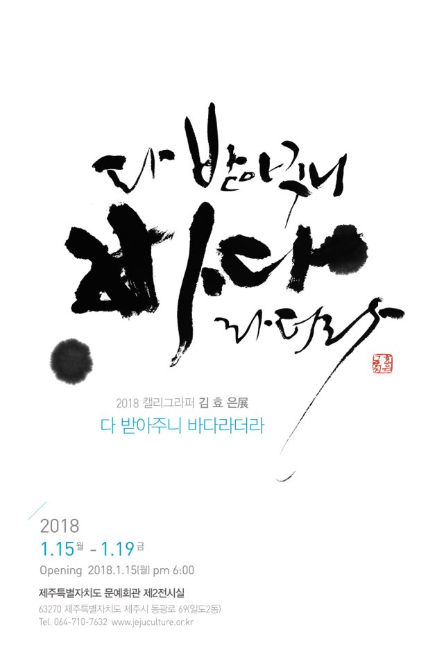 2018 캘리그라퍼 김효은展 '다 받아주니 바다라더라' 2017.01.15(월) -01.19(금) 제주문예회관 제2전시실 오프닝 01.15(월) 18:00