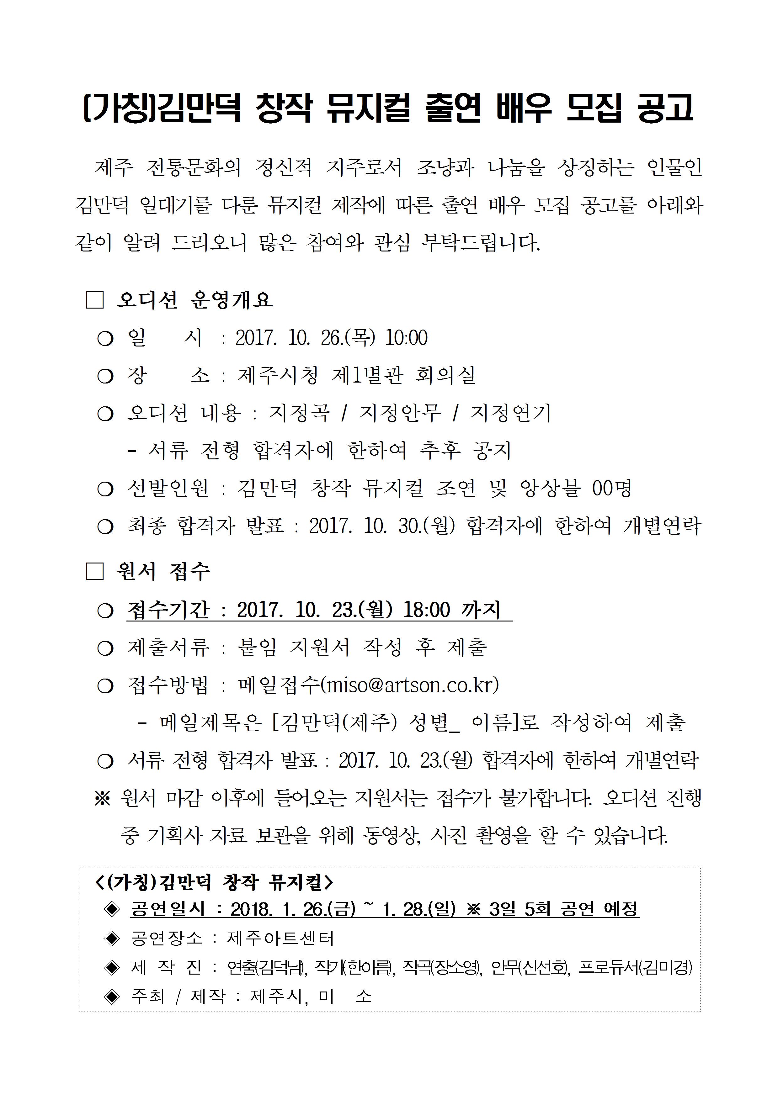 | 제목 | (가칭)김만덕 창작 뮤지컬 출연 배우 모집 공고 | ||