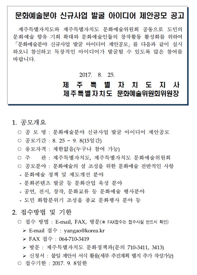| 제목 | 문화예술분야 신규사업 발굴 아이디어 제안공모 공고(~9.8.) | ||