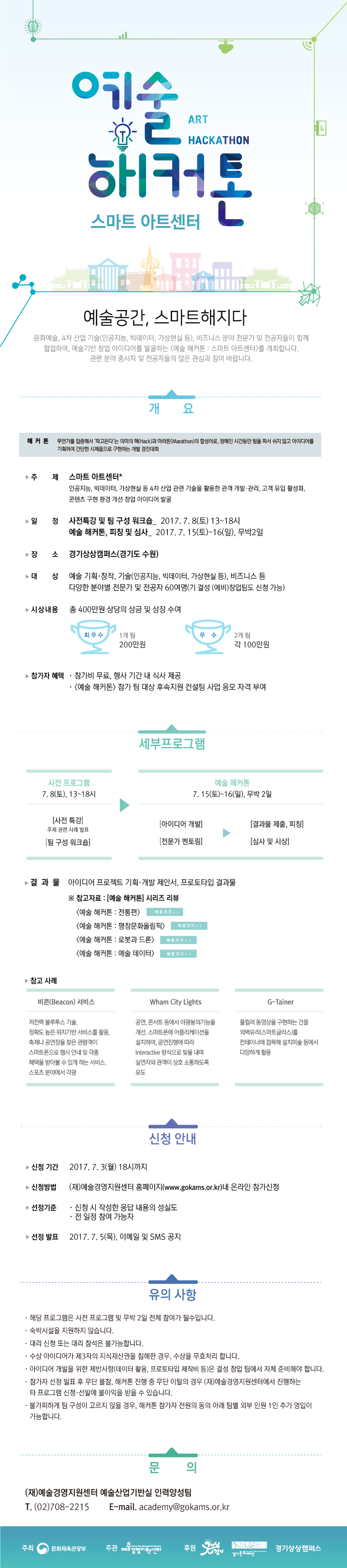 | 첨부 #1 | [붙임1]예술 해커톤_스마트 아트센터 안내문.pdf (268 KBytes) | ||