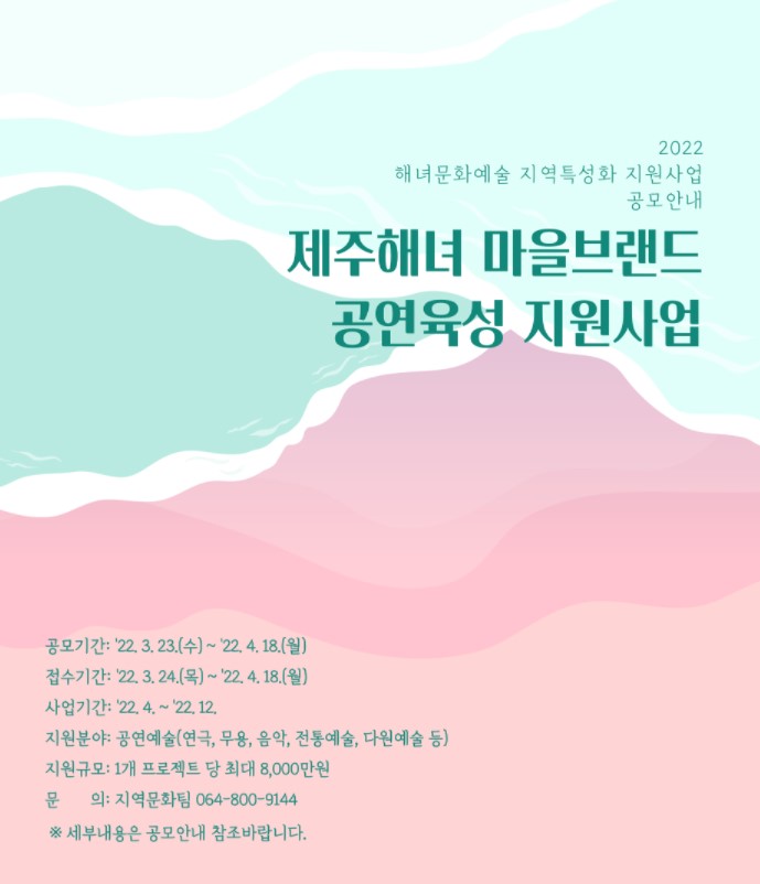 | 제목 | [공고] 2022년 제주해녀 문화예술 지역특성화 지원사업 <마을브랜드 공연육성지원사업> 공모 안내 | ||
