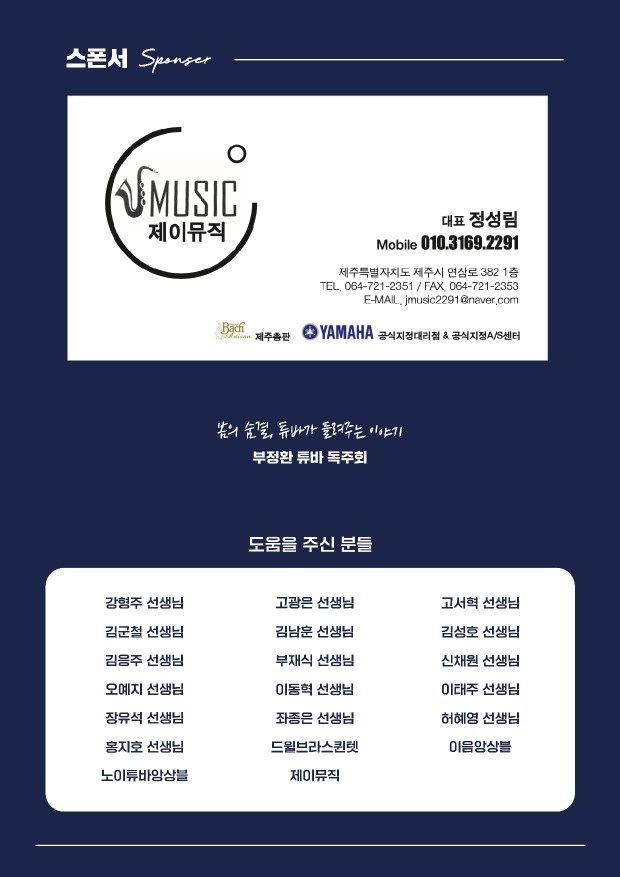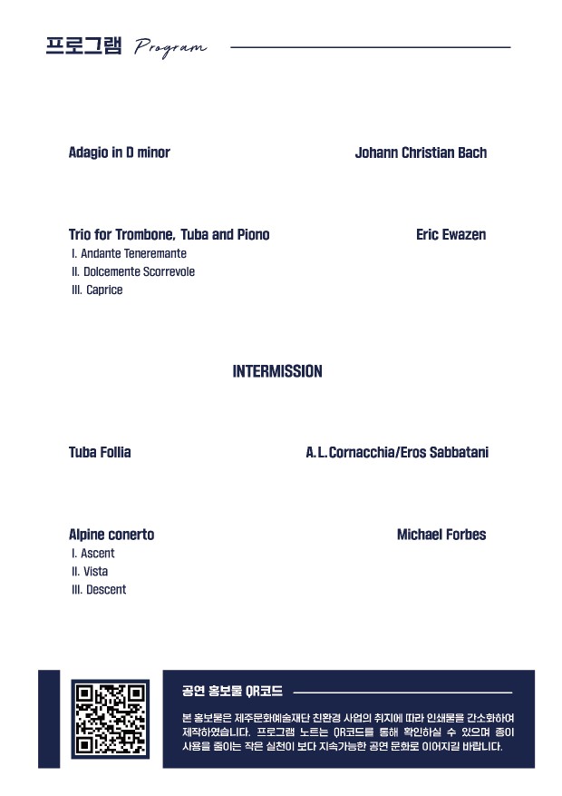 - 관객이 튜바를 단순한 저음 악기가 아닌, 선율을 이끄는 주역 악기로 인식의 전환을 할 수 있도록 하며, 해설을 통해 작품의 배경과 감상 포인트를 제공함으로써 클래식 감상의 진입장벽을 낮추는 것이 목표입니다.