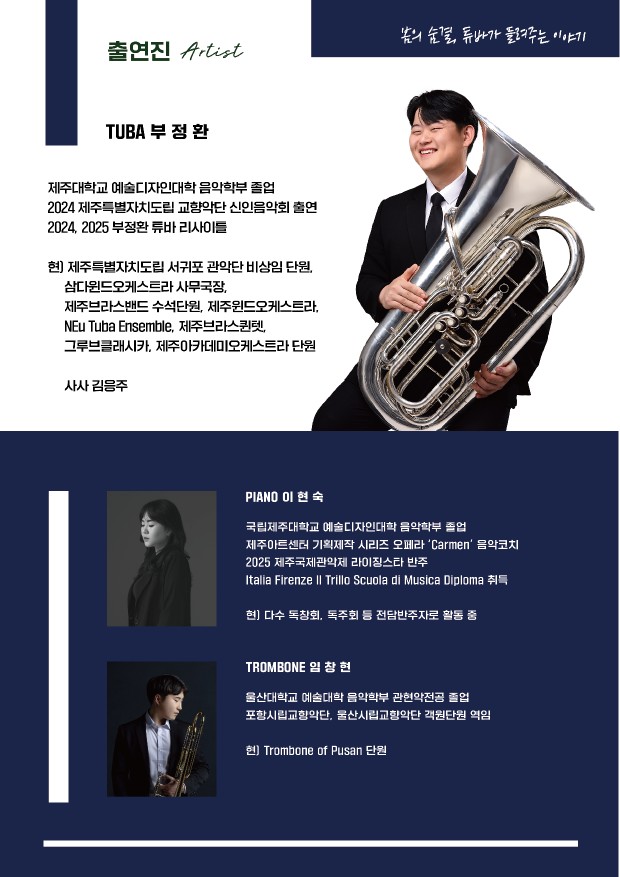 - 부정환 튜바 독주회 “봄의 숨결, 튜바가 들려주는 이야기”는 [봄]이 상징하는 정서인 생동감, 설렘, 확장감을 튜바의 음색과 레퍼토리 서사로 풀어내는 해설형 공연입니다.
