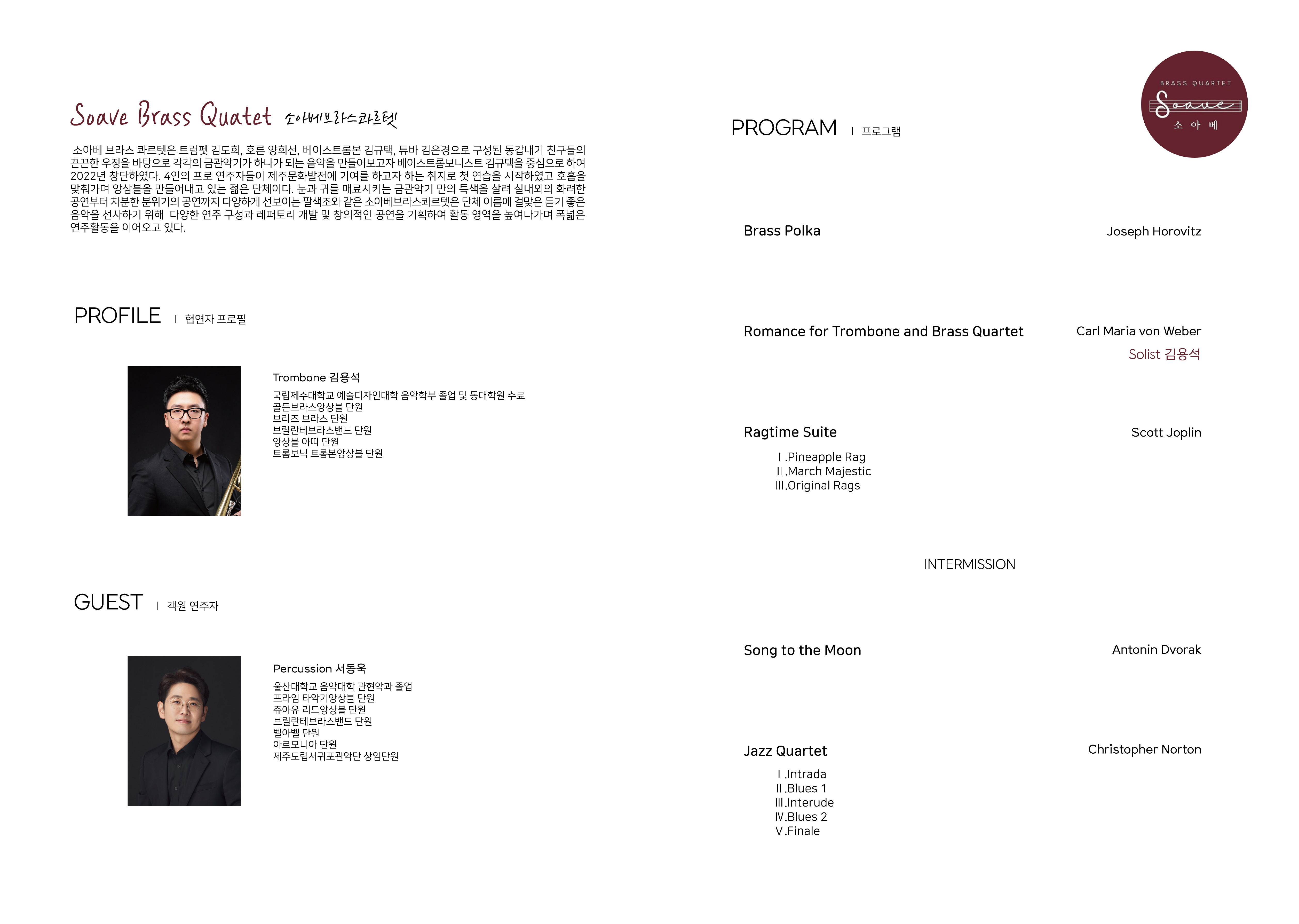 ○ Brass 대표적인 악기들로 구성되어 있으며 제주 최초의 금관 4중주 단체로 제주 도민들의 문화 함양을 위해 2022 창단연주회 이후  단단하고 다양하게 짜인 알찬 프로그램을 통해 관객들에게 이색적인 즐거움을 전달하고자 한다.