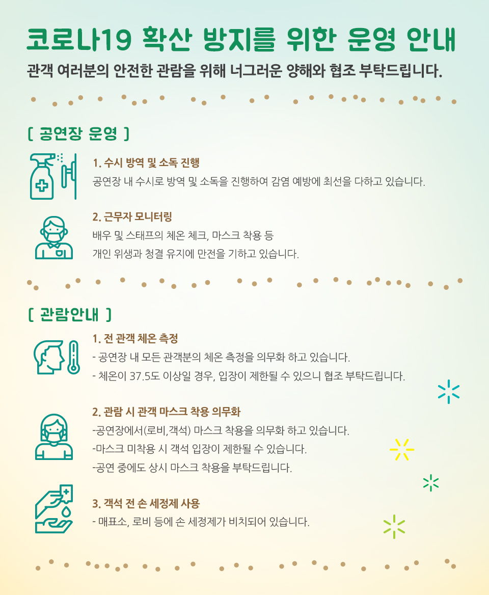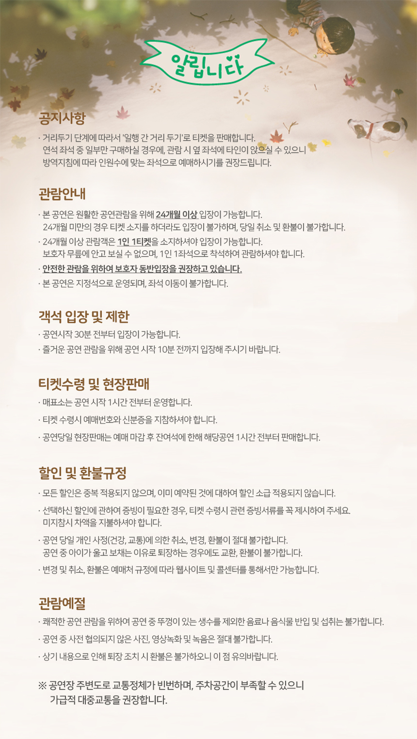 ※ 공연 중 심한 소음 및 행동은 다른 관객들에게 불편을 초래할 수 있으니 자녀들의 올바른 관람 지도 부탁드립니다.