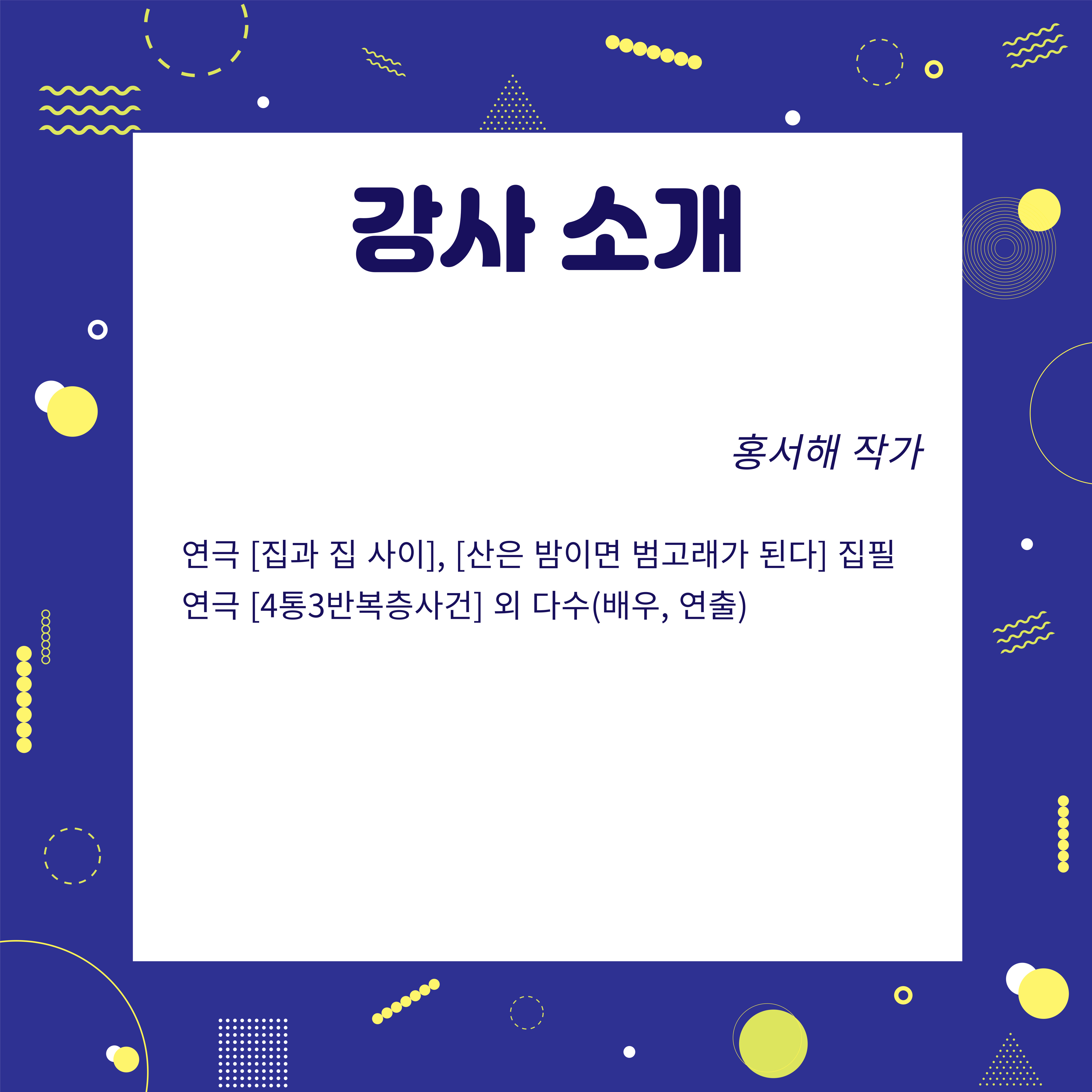 - 모집 대상: 희곡에 관심이 있고 이를 써보고 싶은 사람이면 누구나 참여 가능합니다. 단, 출석, 과제 등 워크숍 프로그램에 성실히 임할 수 있어야 합니다.