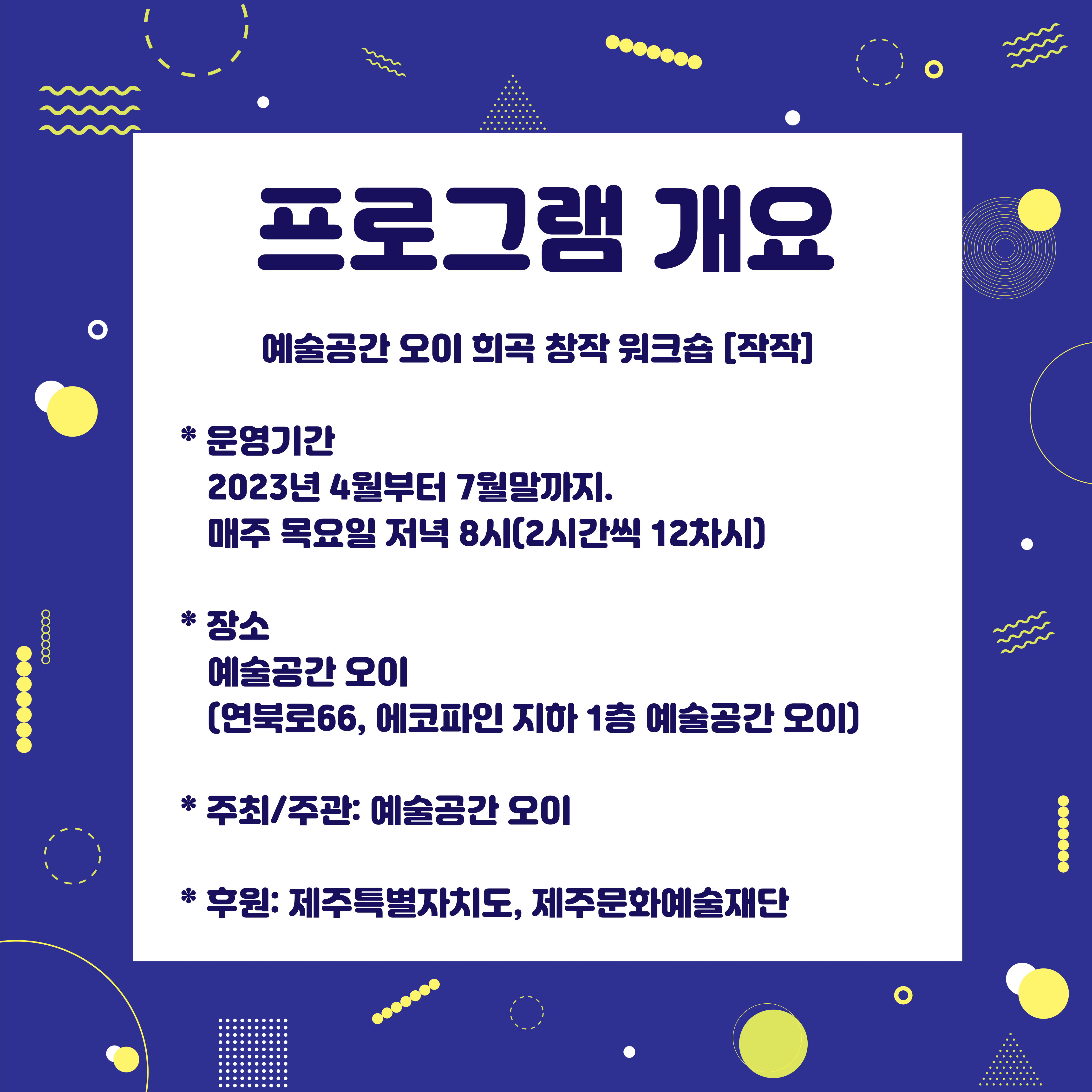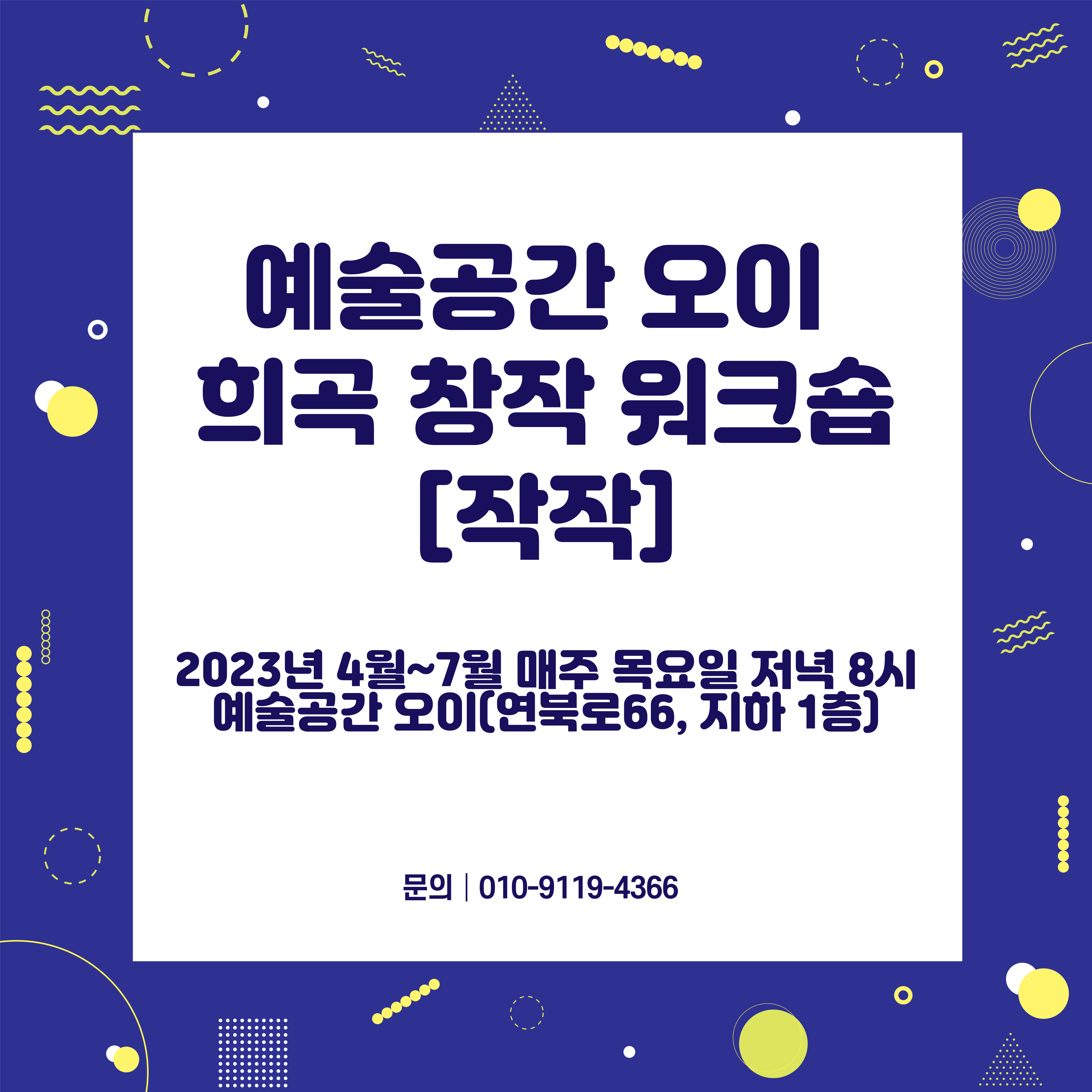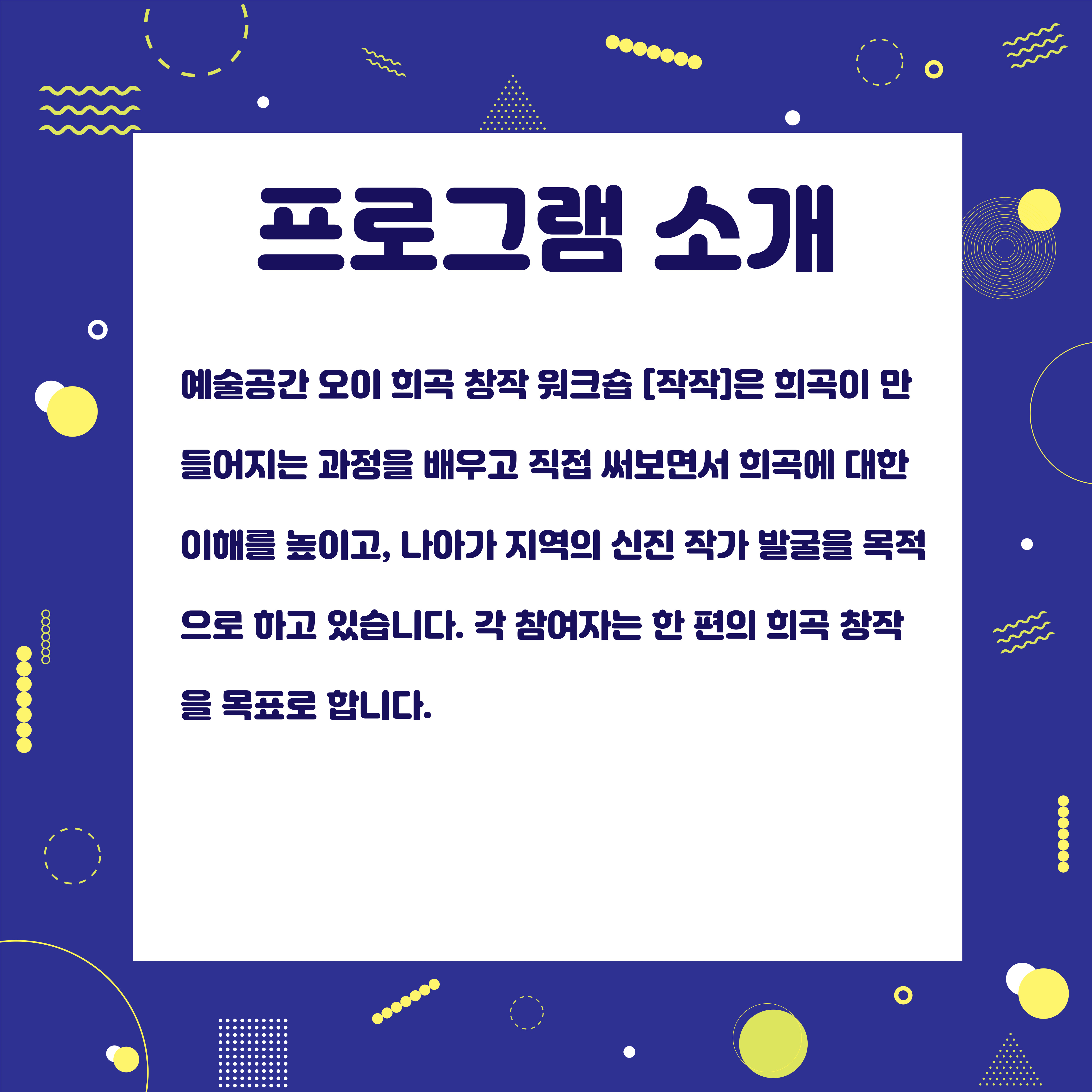 - 내용: 예술공간 오이 희곡 창작 워크숍 [작작_作作]은 희곡이 만들어지는 과정을 배우고 직접 써보면서 희곡에 대한 이해를 높이고, 나아가 지역의 신진 작가 발굴을 목적으로 하고 있습니다. 각 참여자는 한 편의 희곡 창작을 목표로 합니다. 프로그램 특성상 노트북, 태블릿 등 문서 작성이 가능한 장비를 필요로 합니다.