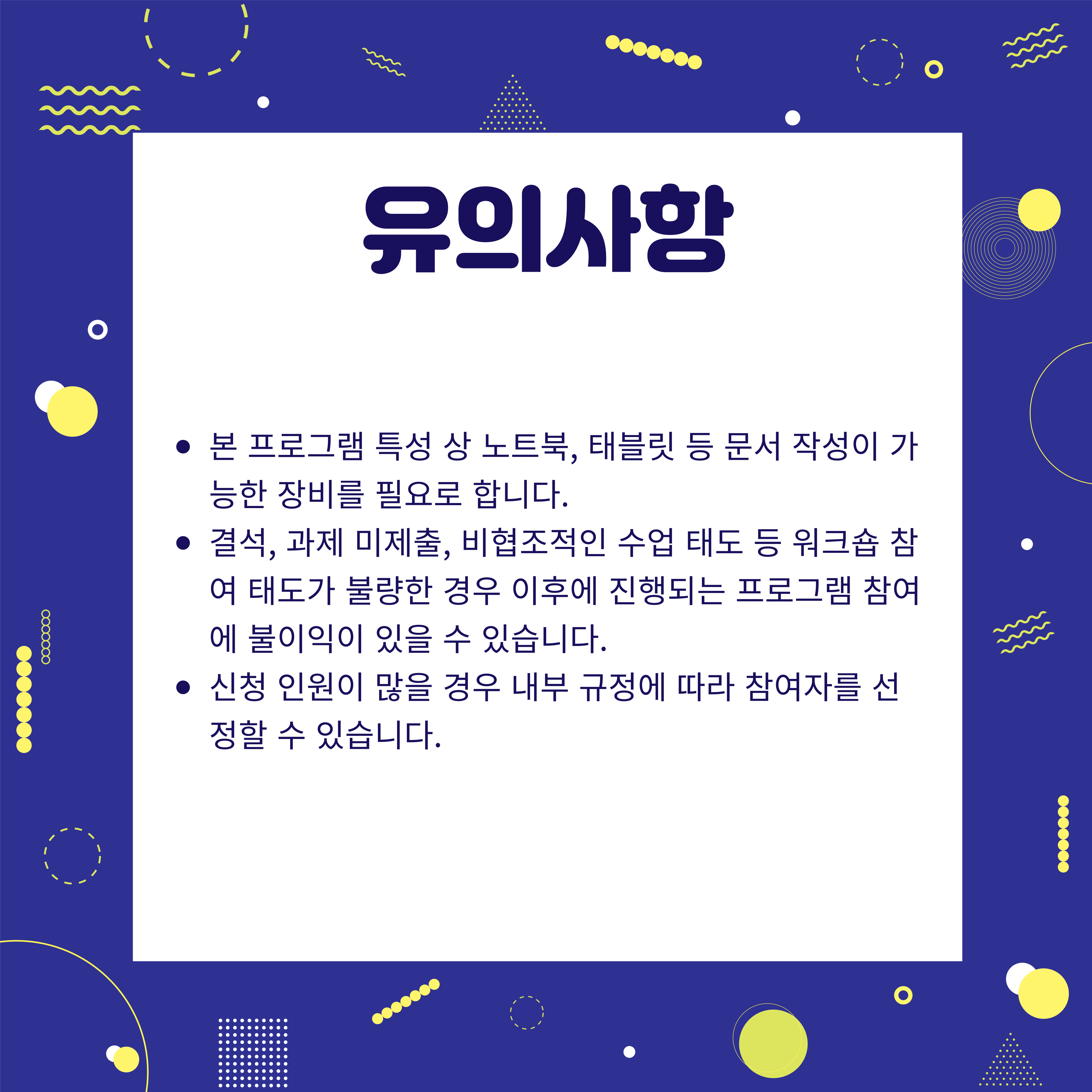 - 유의사항: 프로그램 특성 상 문서 작업이 필요합니다. 때문에 노트북, 태블릿 등 문서 작성을 할 수 있는 장치가 없는 경우 참가가 불가합니다.