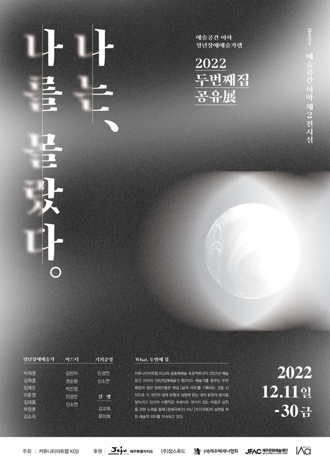 커뮤니티아트랩 KOJI의 공동체예술 프로젝트이자 2022년 예술공간 이아의 <청년장애예술가 랩>이다. 예술가를 꿈꾸는 두번째집의 청년 장애인들은 매일 [삶의 사유]를 기록하는 것을 시작으로 각 개인의 장애 유형과 성향에 맞는 내적 표현의 방식을 찾아가고 있으며 시행착오 속에서도 꺾이지 않는 마음과 실천을 위한 노력을 통해 [장애극복]이 아닌 [자기극복]의 실현을 위한 예술적 의지를 지속하고 있다.