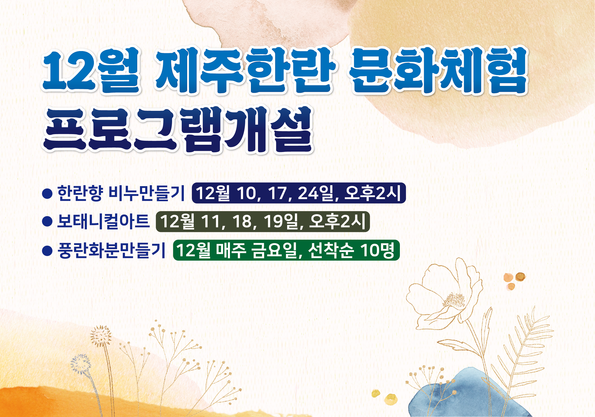 * 한란천연비누만들기 체험(12월 10, 17, 24일), 14~16시, 선착순 30명