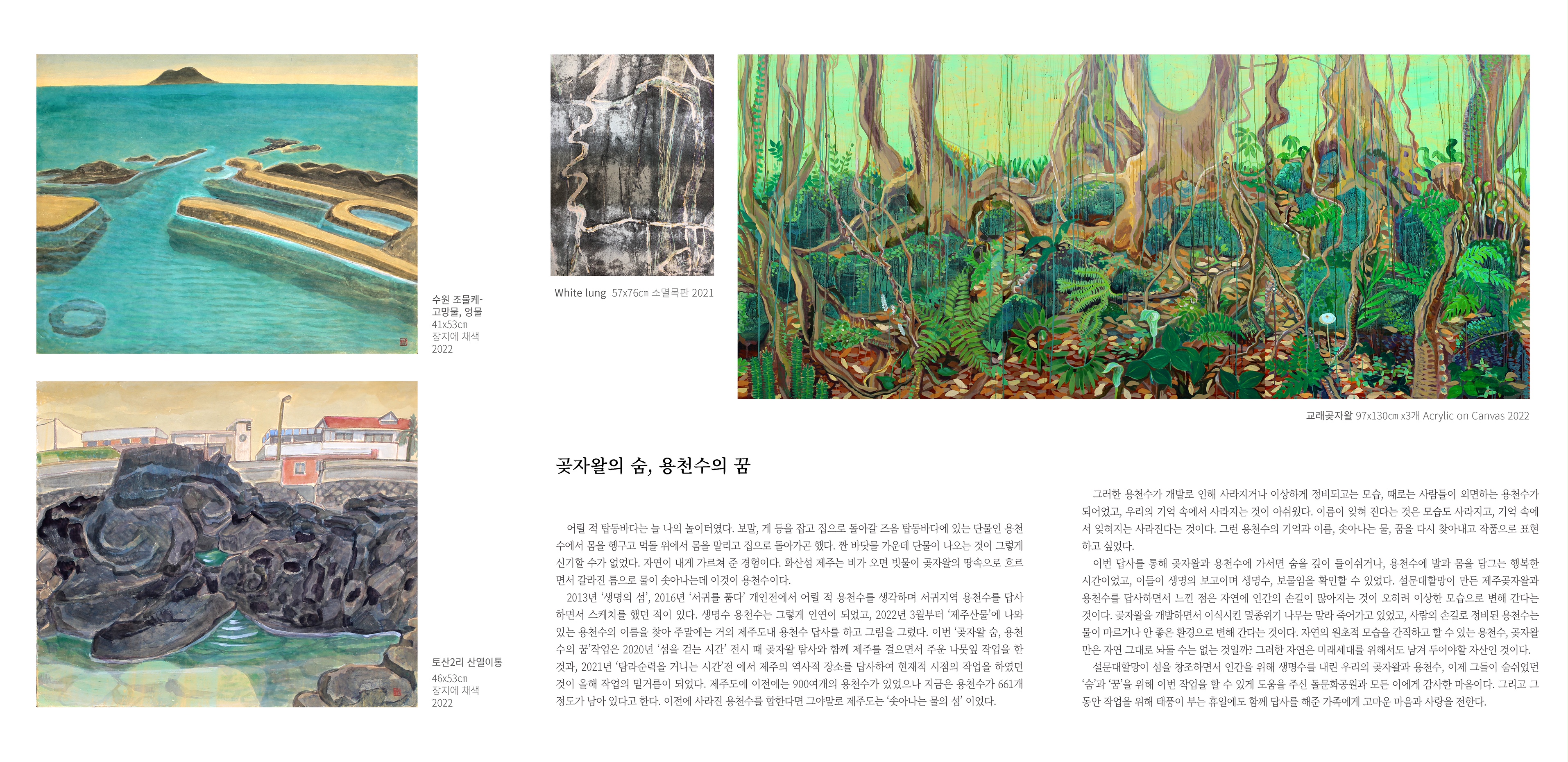 2013년 ‘생명의 섬’, 2016년 ‘서귀를 품다’개인전에서 어릴 적 용천수를 생각하며 서귀지역 용천수를 답사하면서 스케치를 했던 적이 있다. 생명수 용천수는 그렇게 인연이 되었고, 2022년 3월부터 ‘제주산물’에 나와있는 용천수의 이름을 찾아 주말에는 거의 제주도내 용천수 답사를 하고 그림을 그렸다. 이번 ‘곶자왈 숨, 용천수의 꿈’작업은 2020년 ‘섬을 걷는시간’ 전시때 곶자왈 탐사와 함께 제주을 걸으면서 주운 나뭇잎 작업을 한 것과, 2021년 ‘탐라순력을 거니는 시간’전 에서 제주의 역사적 장소를 답사하여 현재적 시점의 작업을 하였던 것이 올해 작업의 밑거름이 되었다.