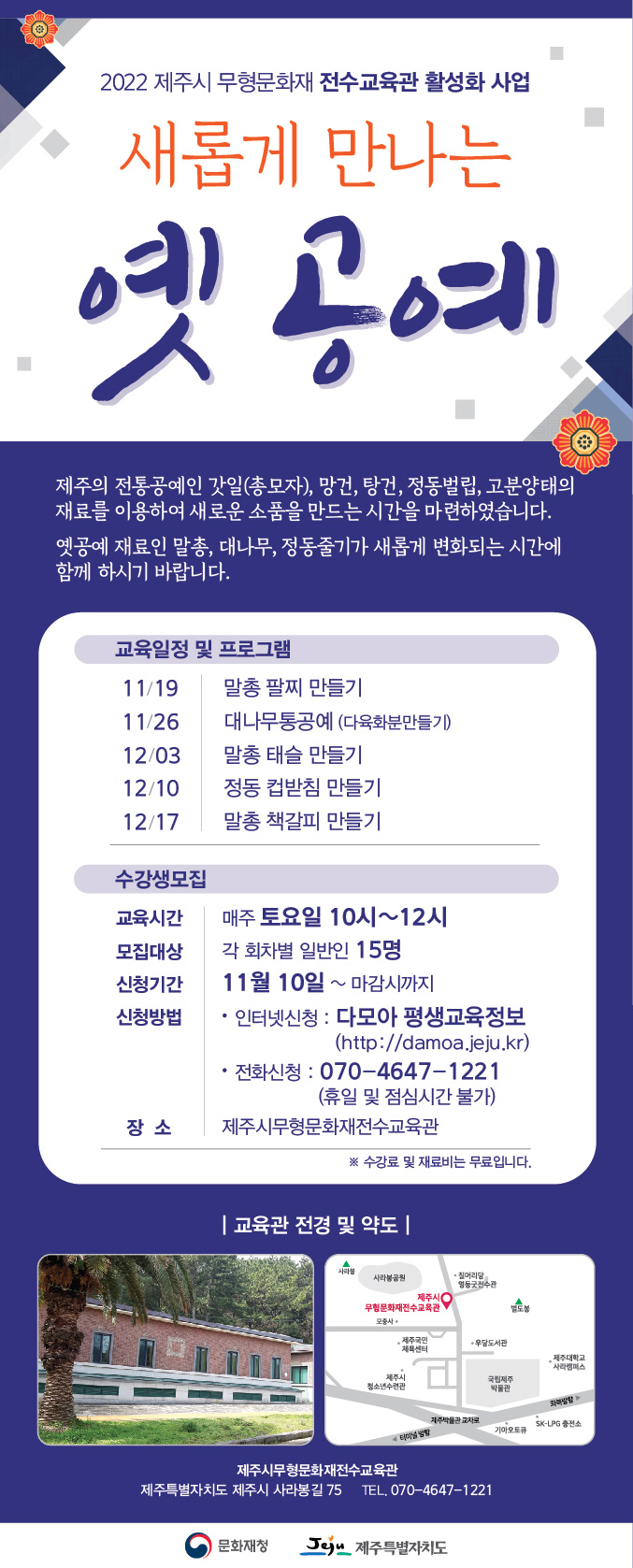 - 주소 (63284) 제주특별자치도 제주시 사라봉길 75 제주시무형문화재전수교육관