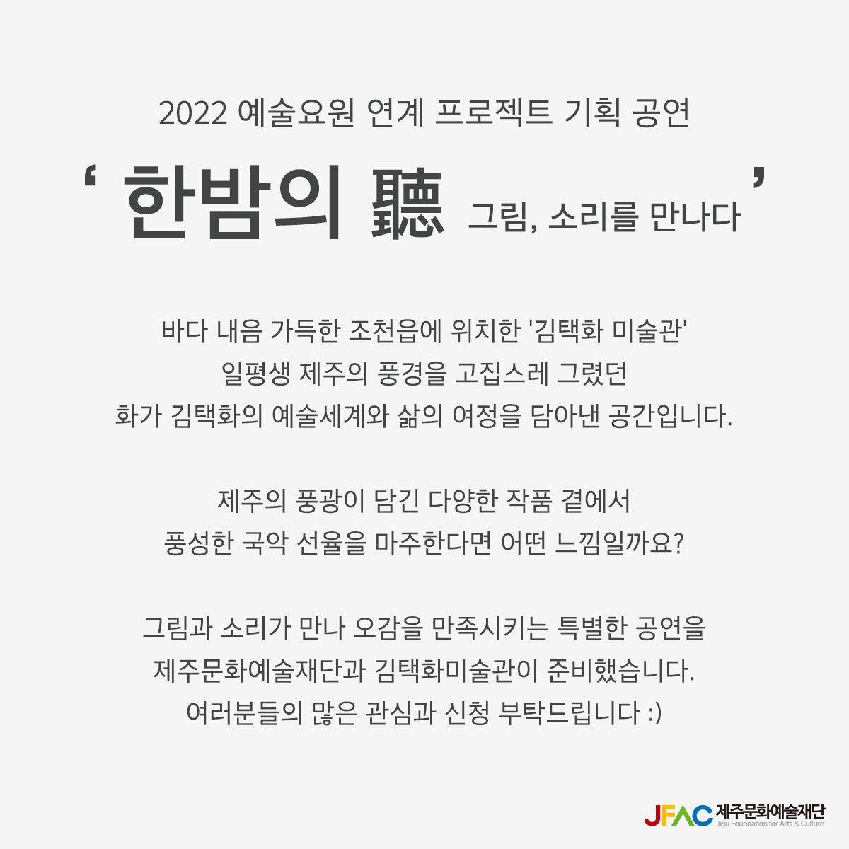 그림과 소리가 만나 오감을 만족시키는 특별한 공연을 제주문화예술재단과 김택화미술관이 준비했습니다.