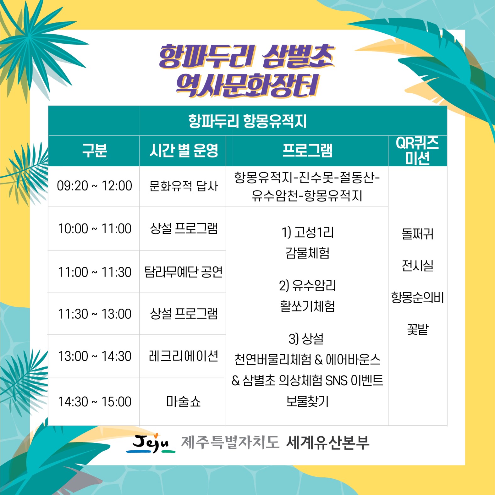 삼별초 의상체험, 전통무예공연, 마술쇼, 유적지 현장 답사, 레크리에이션, QR퀴즈풀이, 보물찾기