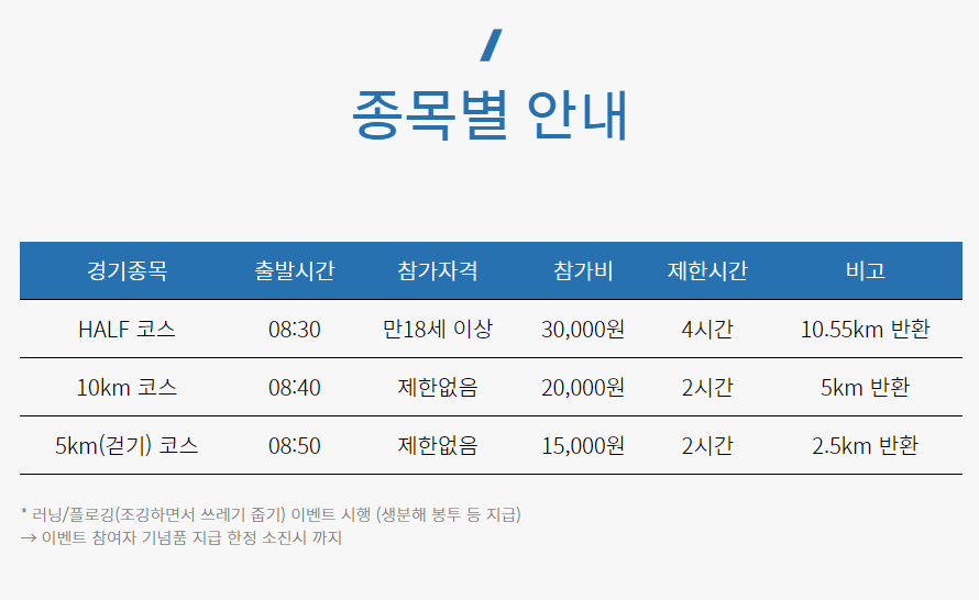 종목 : HALF 30,000원 / 10km 20,000원 / 5km(걷기) 15,000원