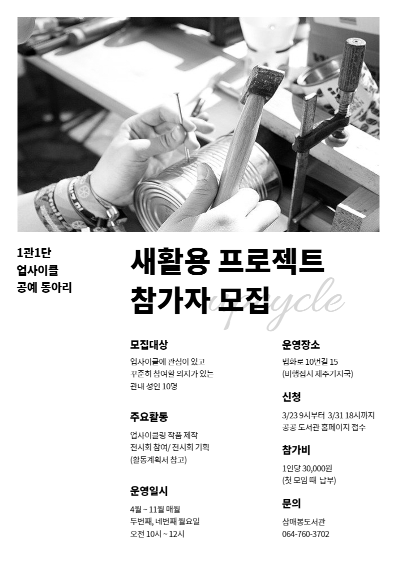 모집대상 : 업사이클에 관심이 있고 꾸준히 참여할 의지가 있는 관내 성인 10명