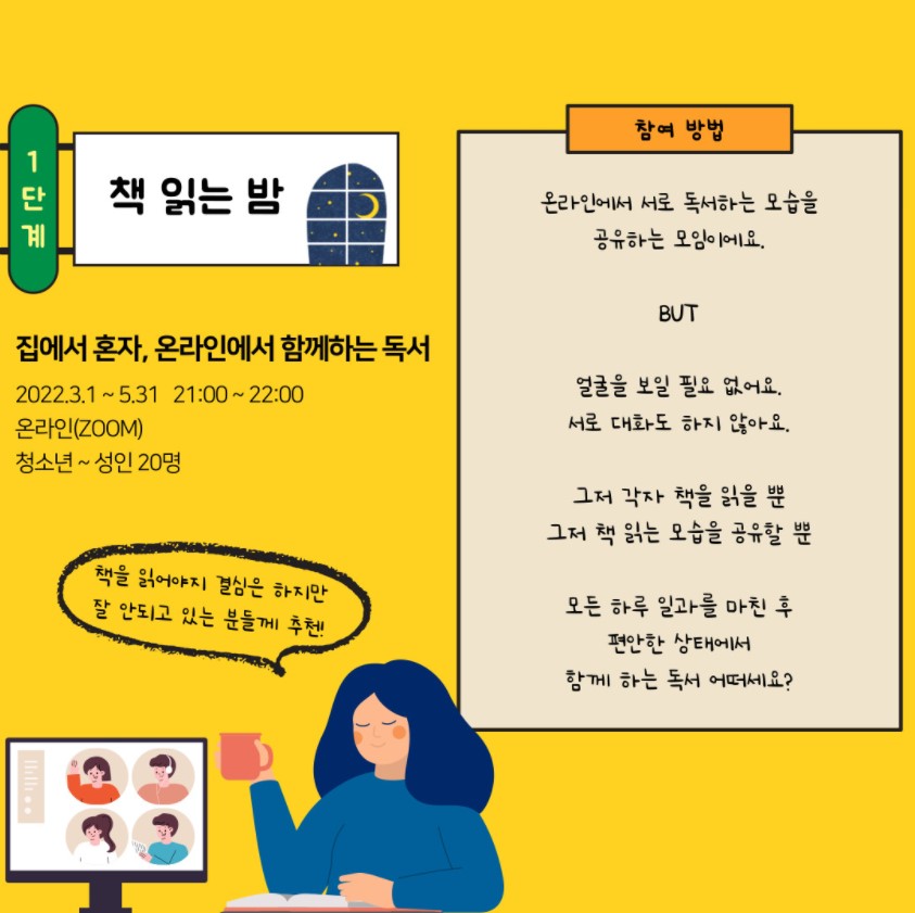 · 얼굴을 보일 필요 없으며, 대화도 없습니다. 각자 책을 읽고 그 모습을 공유합니다.