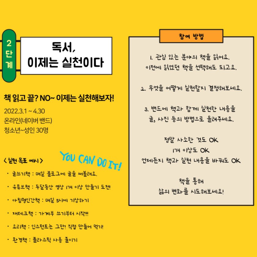 · 관심 있는 분야의 책을 읽고 무엇을 실천할 지 결정한 후 네이버 밴드에 실천한 내용을 글, 사진 등의 방법으로 인증합니다.