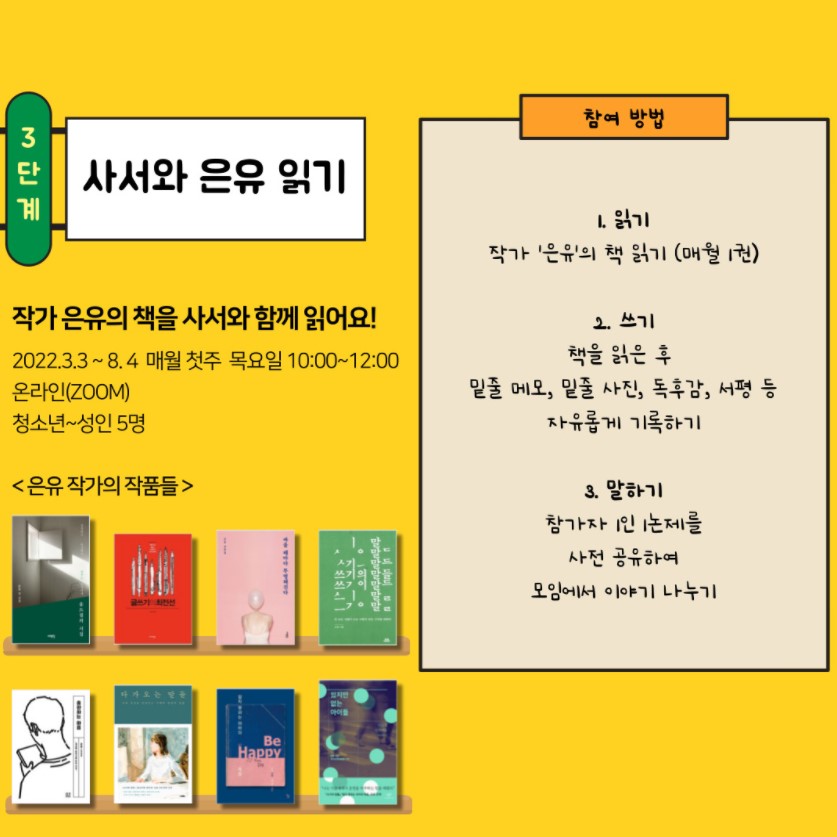 - 내용 : 작가 은유의 책을 매월 1권 읽은 후 쓰고 함께 이야기 나누는 모임