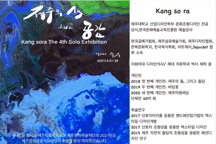 제주를 대표할 수 있는 요소인 돌 / 바다 / 감물 / 동백을 주요 주제로 하여 제주의 색을 표현 한 강소라 작가의 네번째 개인전이다.