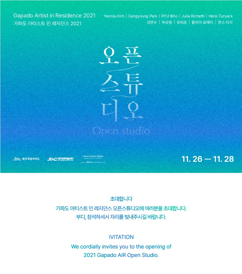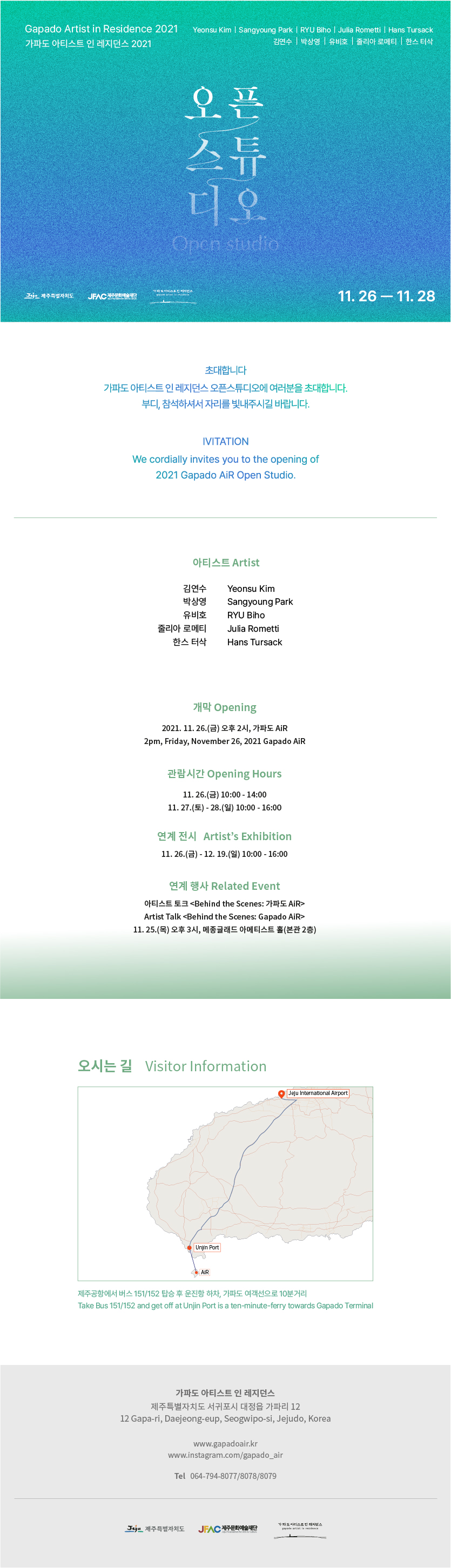이번 2021 가파도 AiR 오픈스튜디오는 지난 9월 입주한 5명의 작가가 가파도 AiR를 통해 경험하고 느낀 성과물과 고립된 공간 속에서의 몰입의 시간을 담은 소중한 창작물을 공유하는 자리가 될 것입니다.