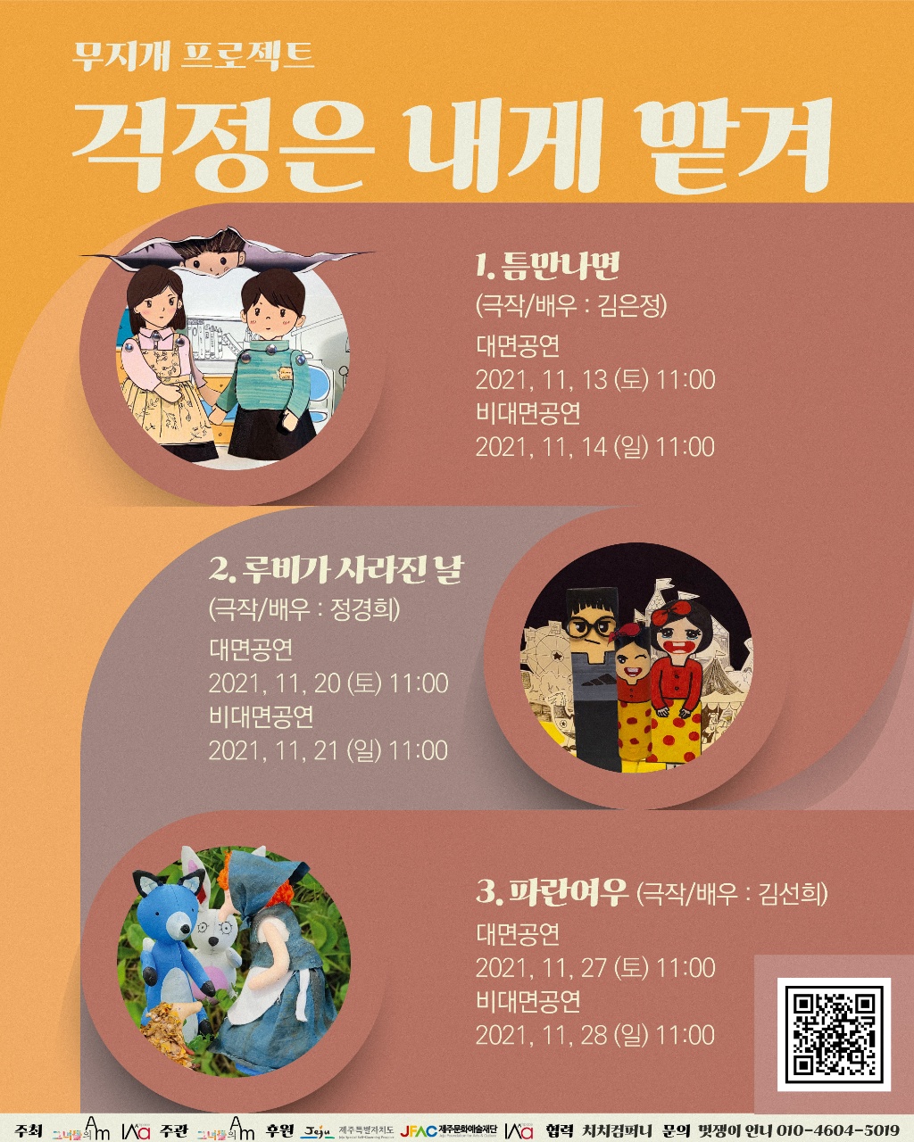 극단 '그녀들의 AM' 과 함께하는 체험형 인형극에 초대합니다. 본 공연은 1인 인형극 관람 후 '걱정인형 만들기' 체험으로 진행됩니다. [틈만나면] , [루비가 사라진 날] , [파란여우] 의 걱정 보따리를 함께 풀어볼까요?