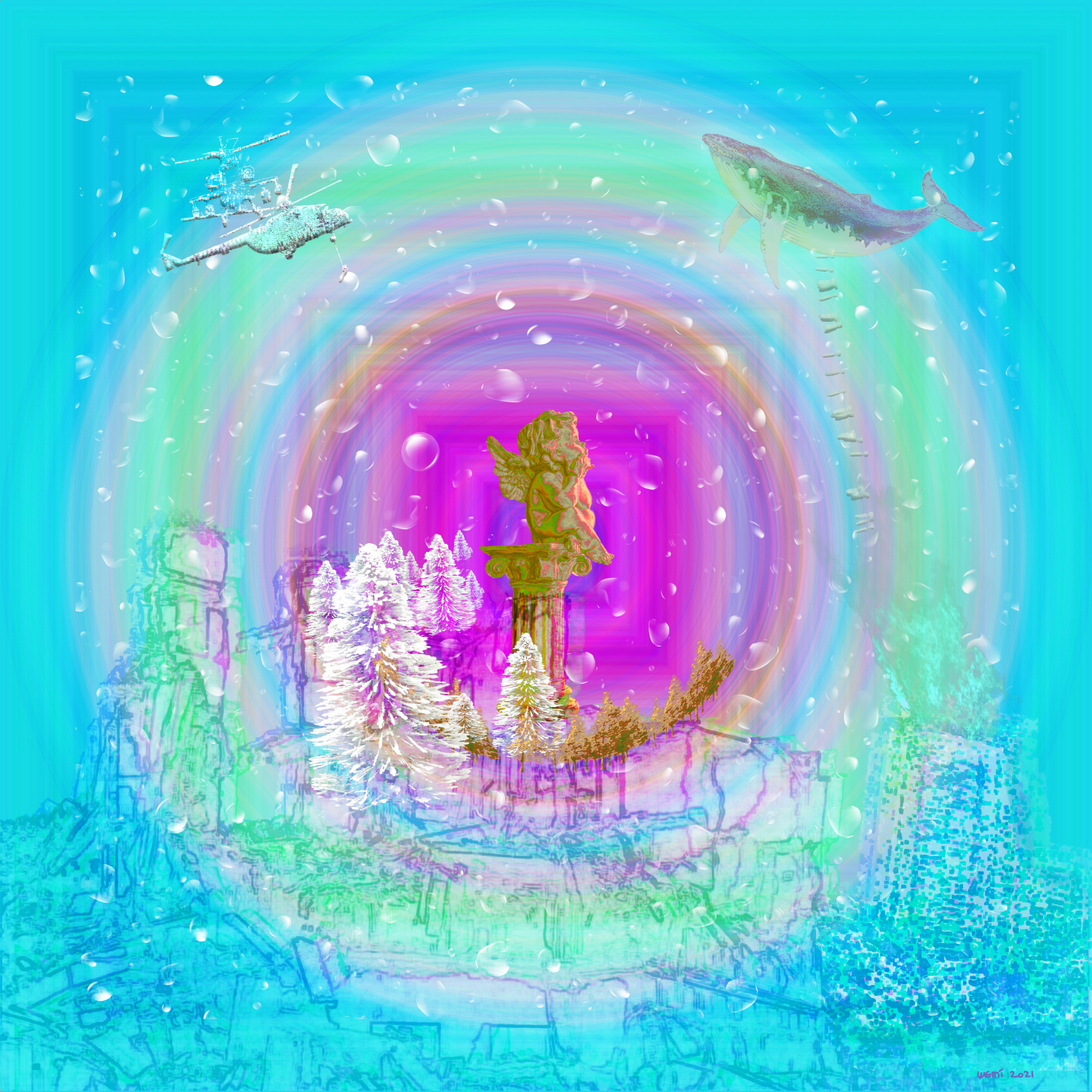 ‘Pray for peace’는 언뜻 황금빛 천사 조각상이 떠다니는 고래를 올려다보는 평화로운 광경이지만 조각상은 전쟁으로 무너진 건물의 파편위에 앉아 고래와 같은 전투기가 폭탄을 투하하는 것을 지켜보고 있다.