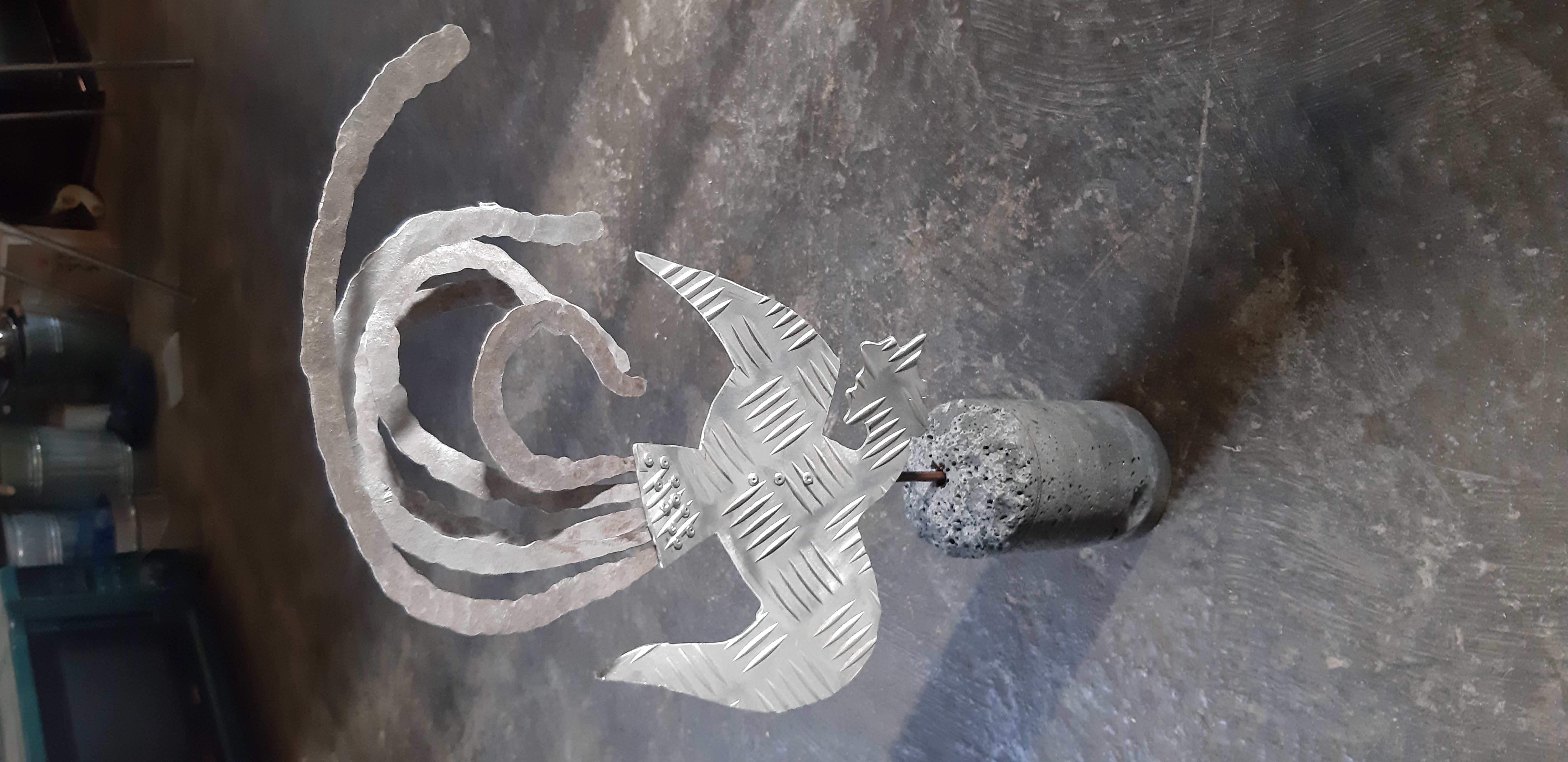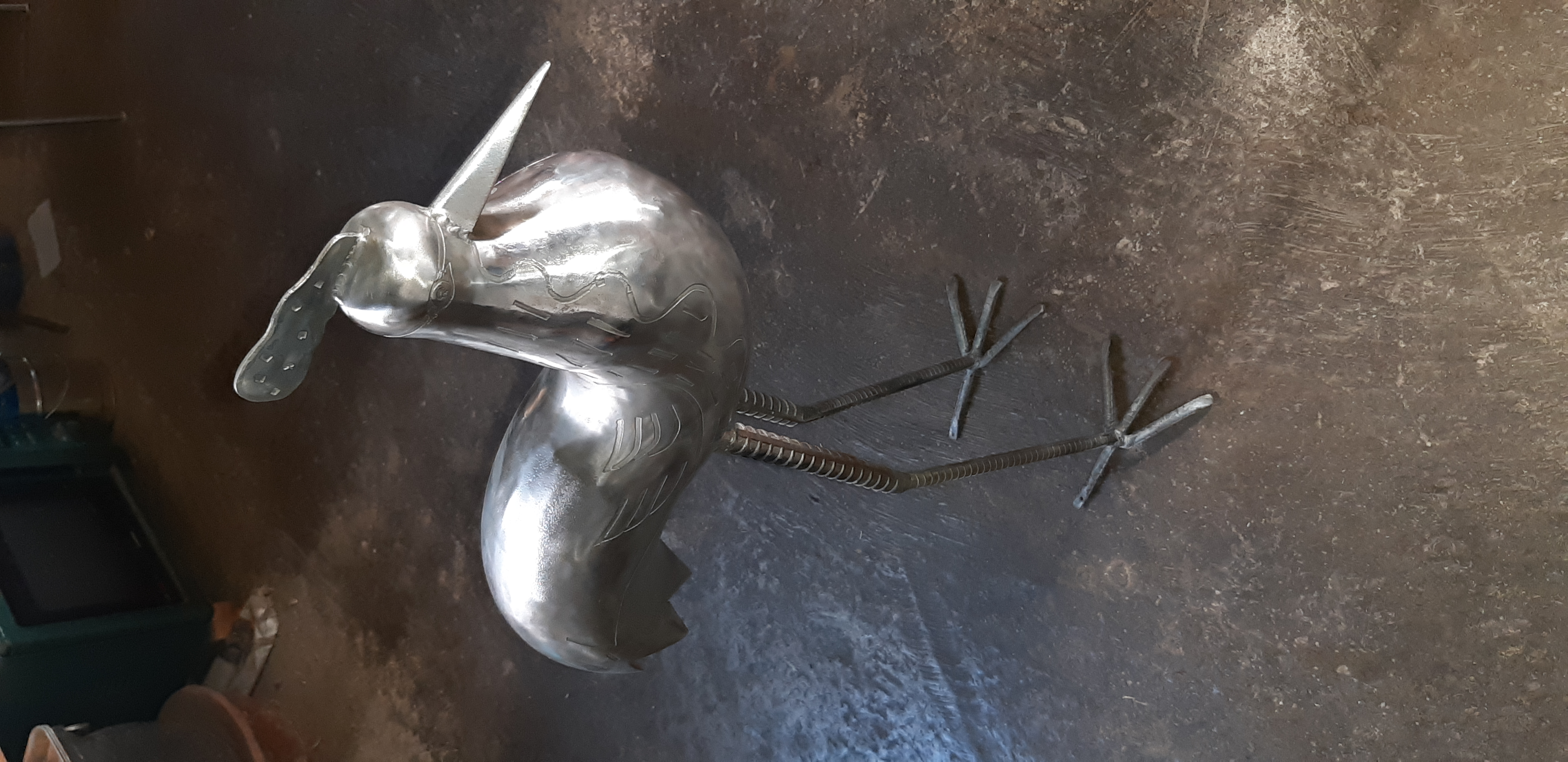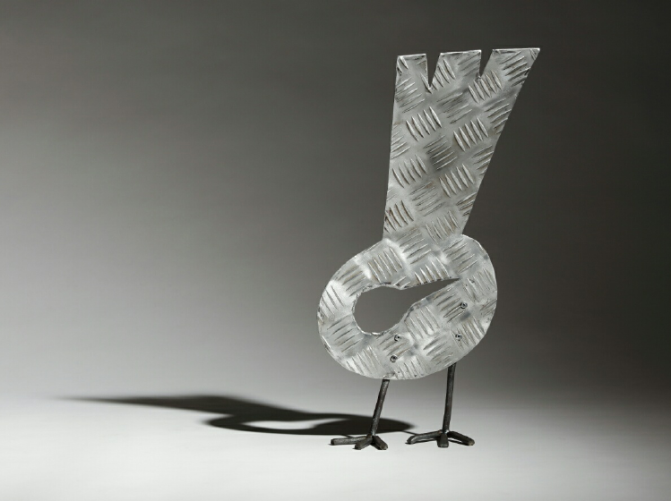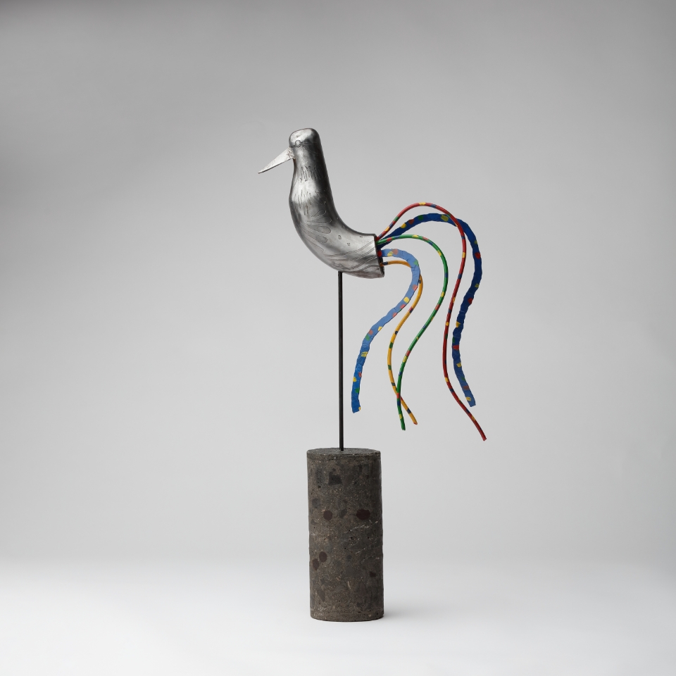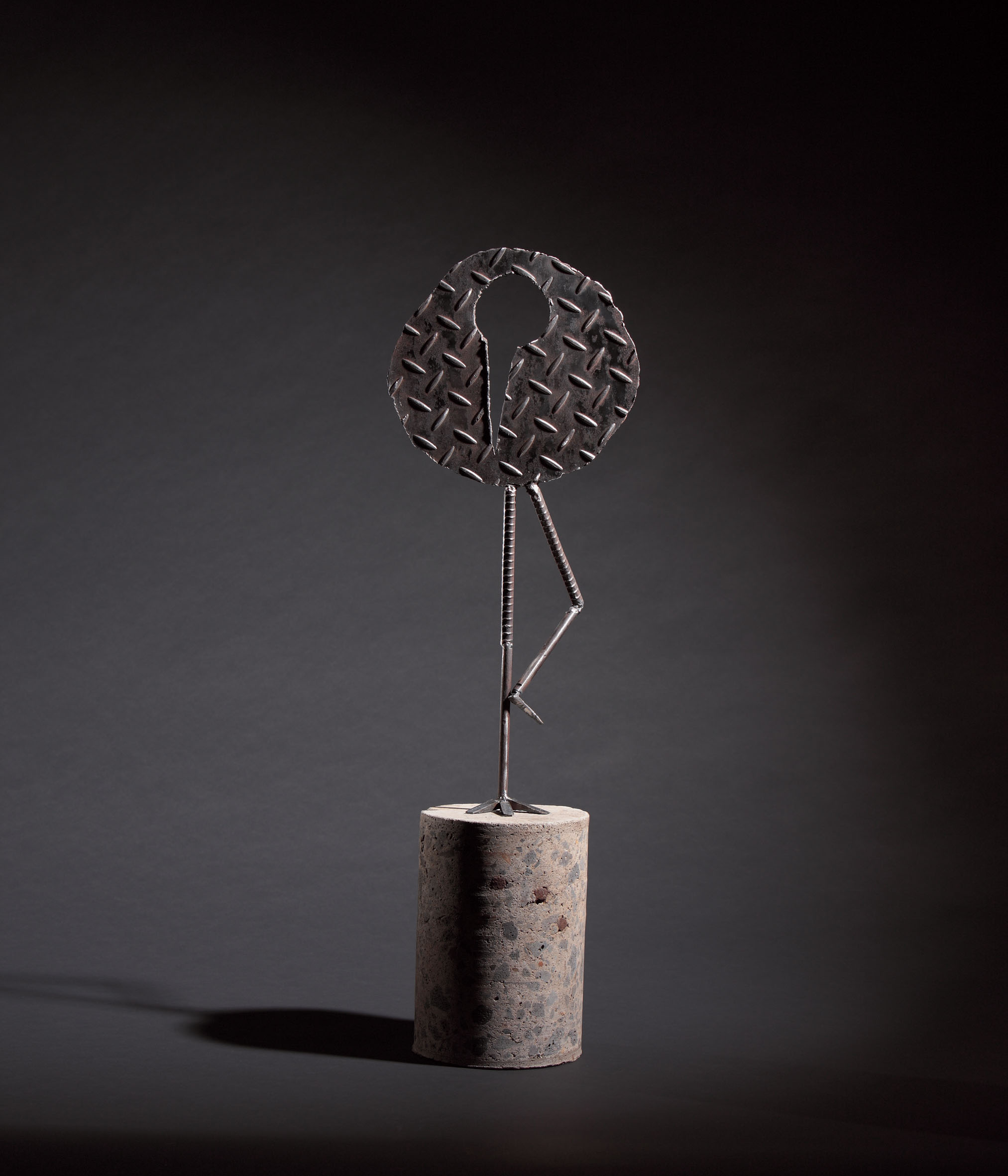 작가는 논슬립 철판에 물리적인 변화를 가했을 때 얻어지는 요철의 변화 속에서 새 깃털의 질감을 떠올리게 되어 새의 연작을 제작했다. 이번 전시에서는 알루미늄 판재를 절단하고, 두드리며, 구부리는 등 다양한 물리적 변화를 통해 작품을 완성하였고, 수도배관에 사용하는 배관 자재를 연결, 용접, 연마하기도 했다. 또한 다양한 시행착오 끝에 판화에 사용되는 산(酸)의 부식작용을 이용하는 에칭 기법으로 새의 형상과 깃털의 질감을 표현했다. 최근에는 민화에 주로 사용하는 오방색을 입혀 작품에 화려함을 보태며 만물의 생성과 소멸의 순환원리라는 독특한 상징의 세계를 그려내고 있다. 작가는 이번 전시를 통해 “코로나 팬데믹 상황 속에서 지치고 힘든 사람들에게 새가 빚어내는 다양한 형상의 조형미를 통해 인간 존엄과 가치에 대한 근원적 질문에 자문하는 시간이 되길 바란다.”며 짧은 소회를 전했다.