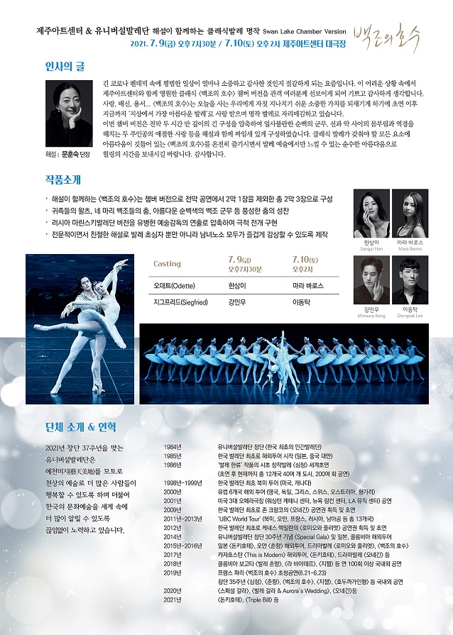 - 해설이 함께하는 <백조의 호수>는 챔버 버전으로 전막 공연에서 2막 1장을 제외한 총 2막 3장으로 구성