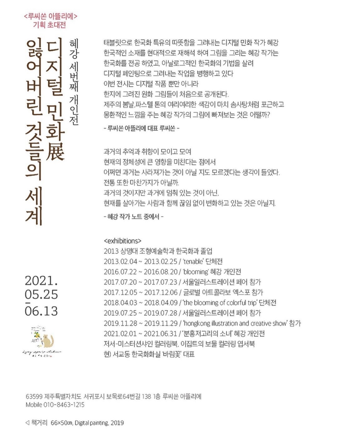 한국적인 소재를 현대적으로 재해석하여 그림을 그리는 헤강 작가는 한국화를 전공하였고 아날로그적인 한국화의 기법을 살려 디지털페인팅으로 그려내는 작업을 병행하고 있습니다.