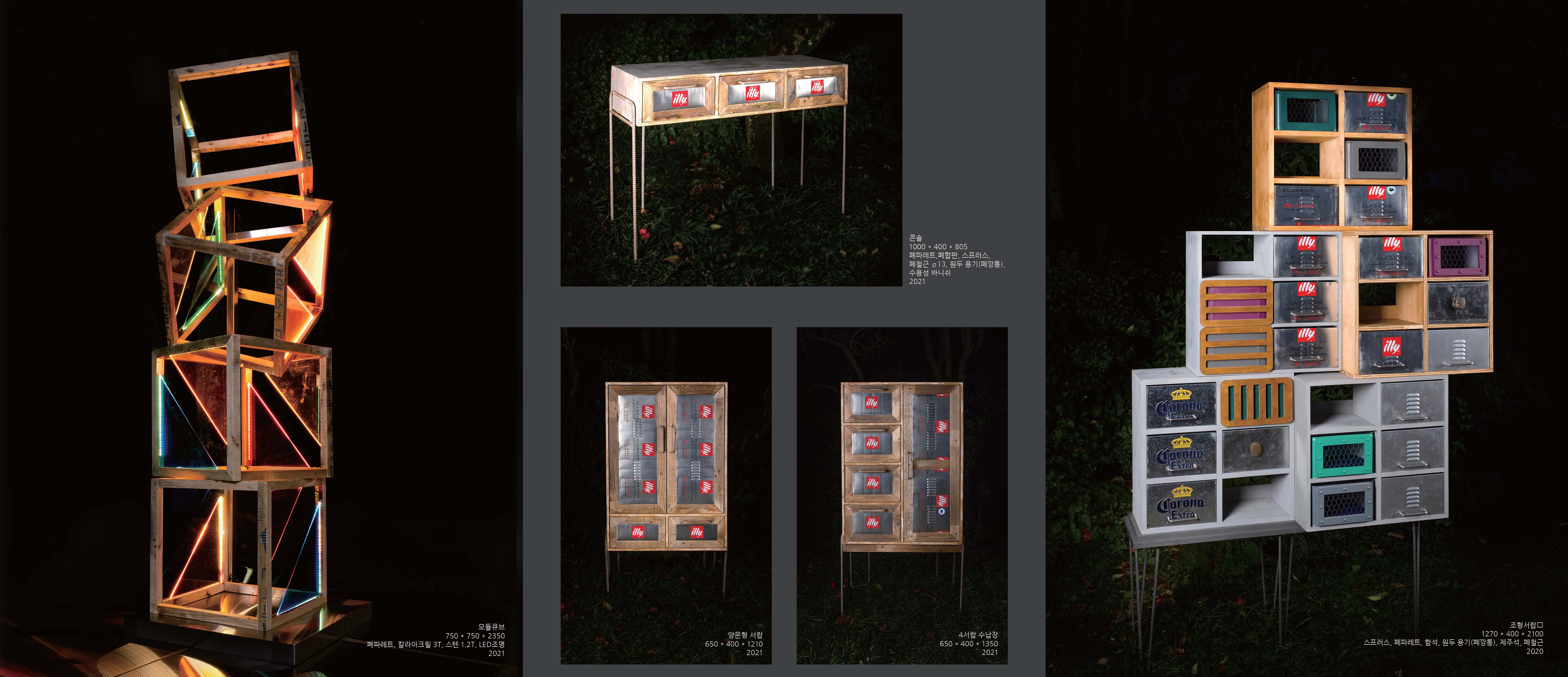 반면 이번 전시에서 폐파레트의 합판을 활용한 콘솔, 수납장은 가공을 최소화하여 재료 본연의 미를 살렸고, 지난 전시회와 다르게 더 세밀한 파레트 분해를 통해 다양한 디자인을 선보인다. 원두커피의 용기인 폐깡통은 기존 원통의 형태를 절단하여 면으로 가공하여 활용했다.