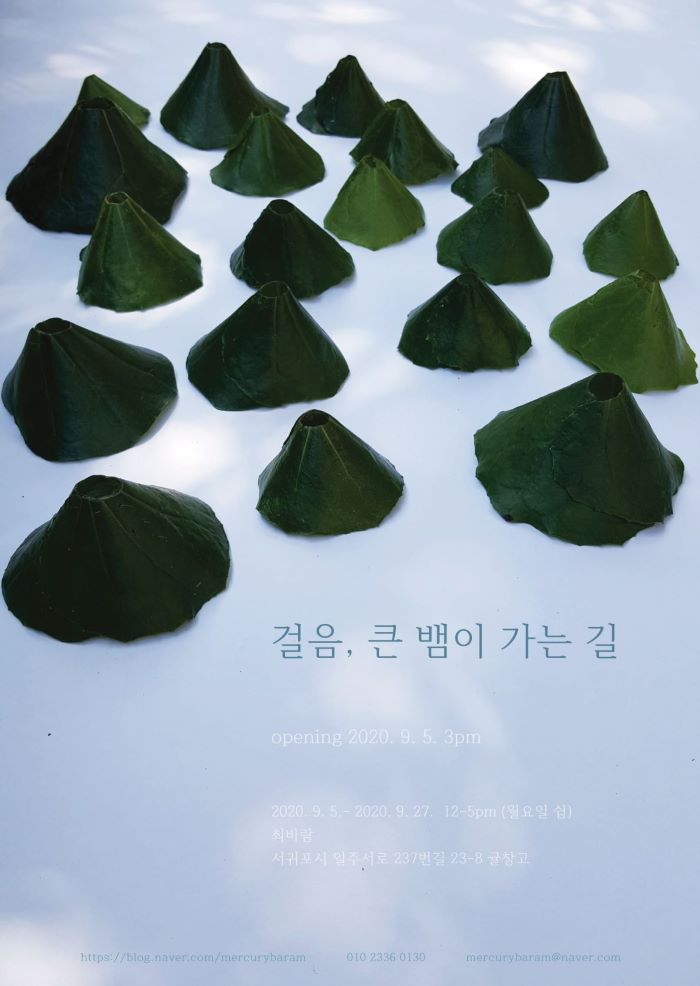 이번 전시에 사용하는 털머위잎은 제주에 많은 식물로 집 앞에 사계절 내내 무성히 자라고 있다. 나무를 파서 오목한 형태를 만드는 작업을 오랫동안 하고 있다. 막연하게 무언가를 담을 수 있지 않을까라고 생각했었는데 수면 중 꾸는 꿈을 동기로 하는 전시에 이것을 뒤집어 설치하게 되었다. 무언가를 쏟아내는 형태가 될 수 있다는 것을 알게 되었다. 이제는 화산의 형태와 닮았다는 생각과 폭발이라는 개념을 더하게 되었다. 폭발은 무엇을 담아내고 쏟아내는 행위일 것이며, 행위는 경계 지을 수 없다는 생각이 든다. 작업에 대한 접근은 대체로 모호한 어느 경계에서 발생 된다. 여러 형태의 작업 방식과 함께 나의 방향(태도)의 이유와 근거를 묻고 그것의 무게, 부피, 차이, 밀도 등을 경험하며 스스로를 좀 더 이해하게 된다.