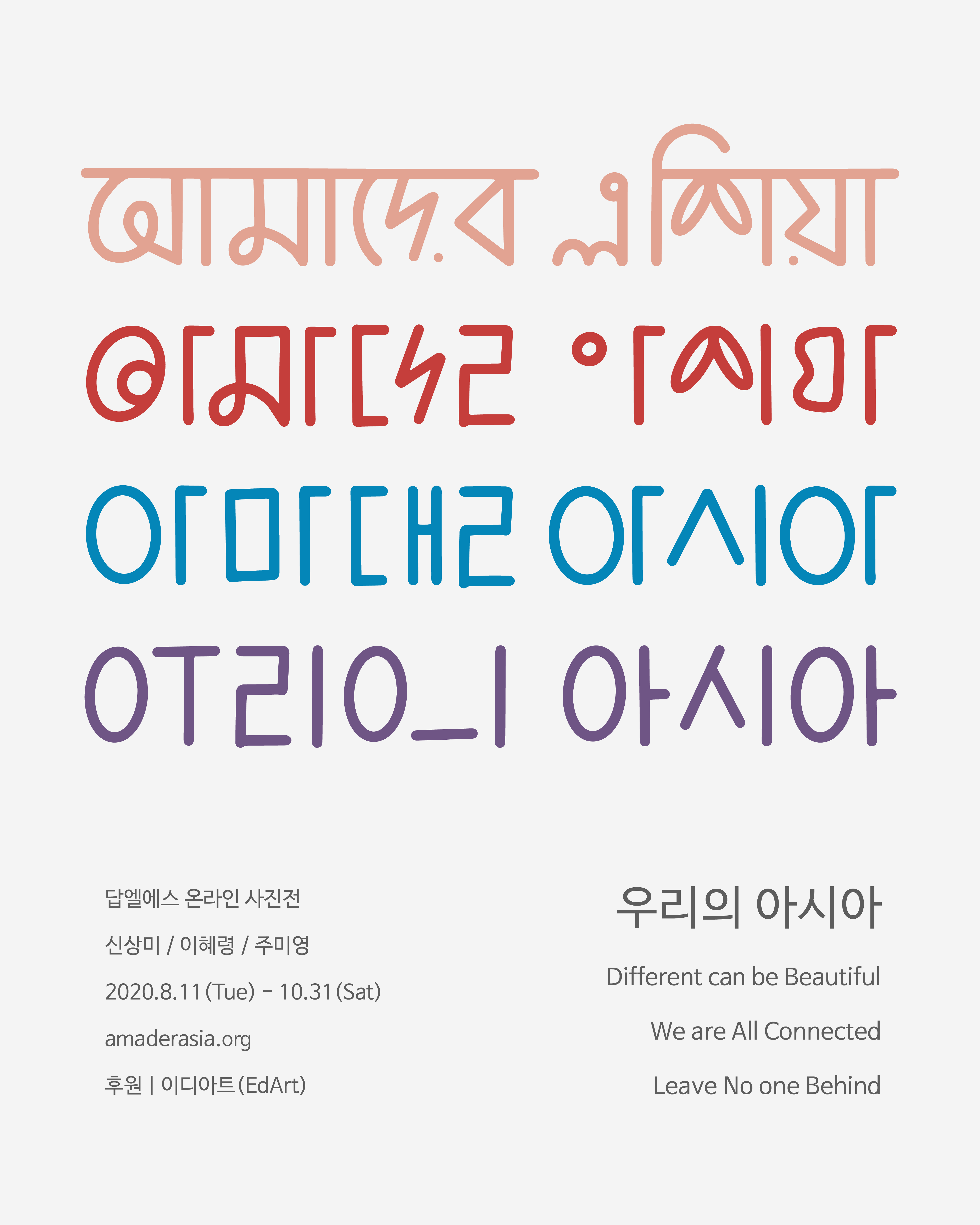 이번 <우리의 아시아> 온라인 전시는 2011년부터 방글라데시와 인도, 네팔 등 남아시아를 오가며 기록해온 사진으로, 낯선 이방인에서 이웃이 되기까지의 여정을 소개한다. 오프라인 전시에서는 미처 선보이지 못한 사진과 영화와 연극 등 상업예술 분야에서 활발하게 활동하고 있는 주미영 작가의 타이포그래피 작품과 영상, 오프라인 전시를 찾았던 관람객의 참여로 구성된 섹션이 새롭게 추가된다.