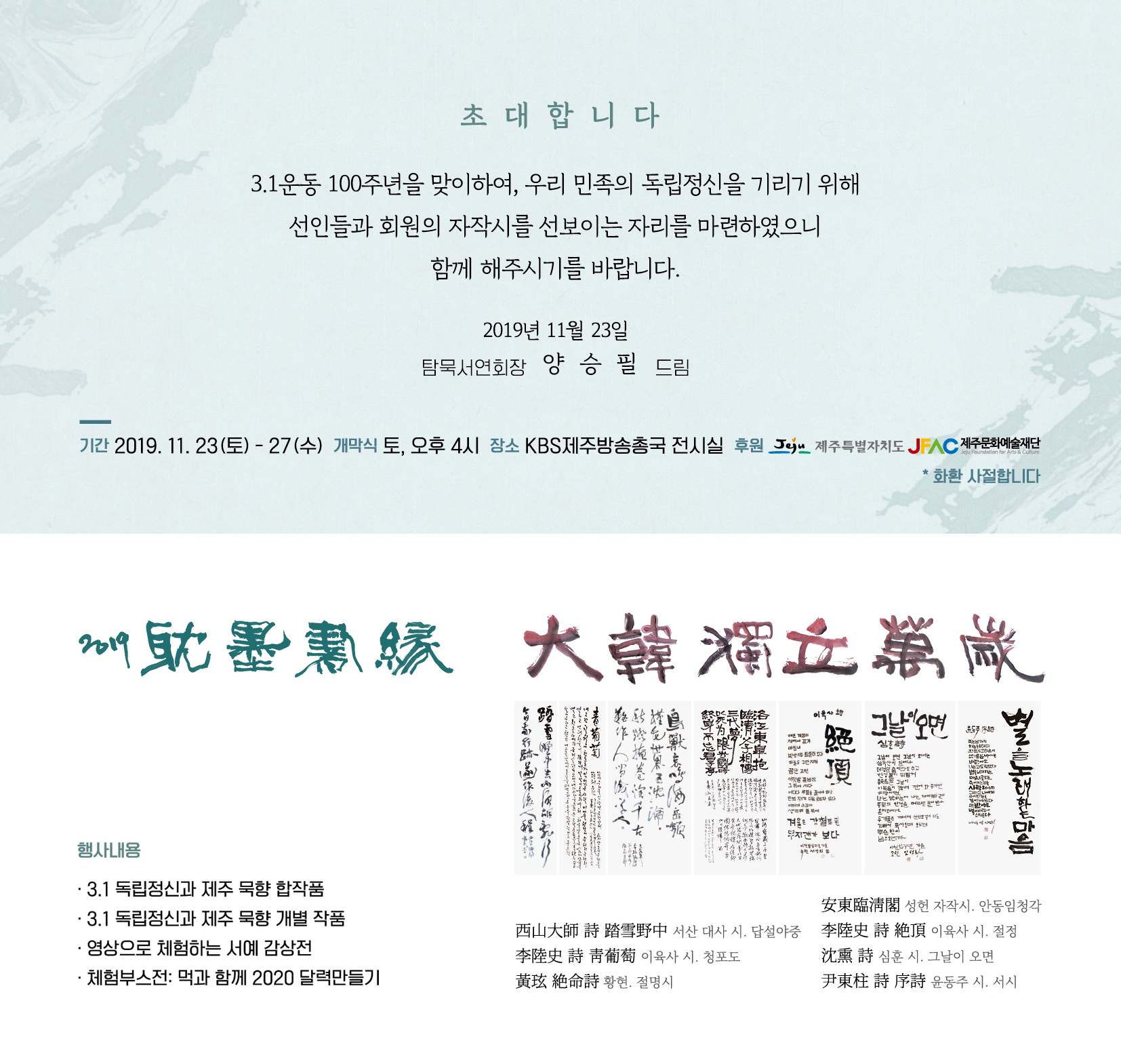 금년 전시 주제는 3.1운동 100주년을 맞는 해이므로 우리 민족의 독립정신을 기리기 위해 선인들과 회원의 자작시를 선보이고 있습니다.