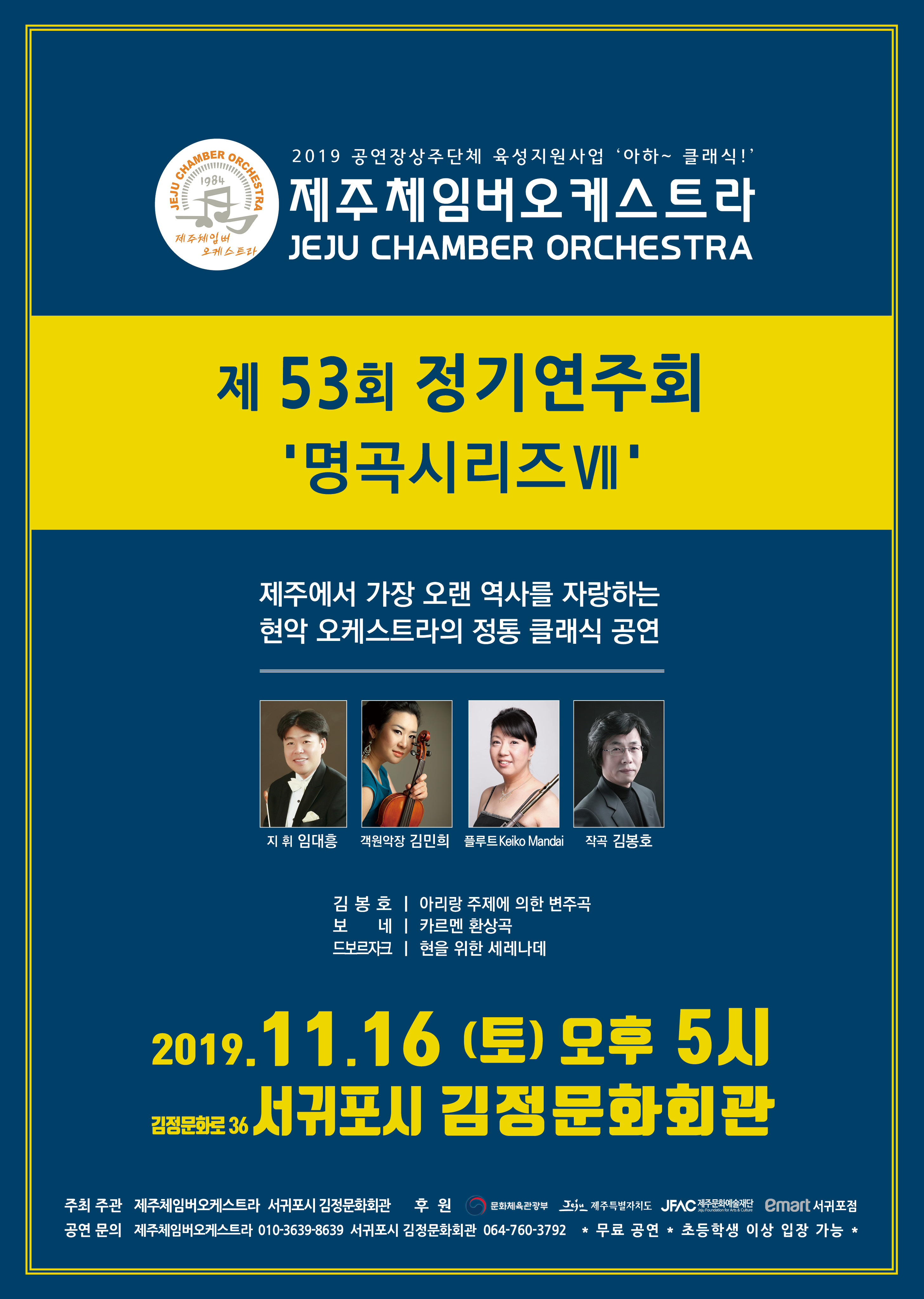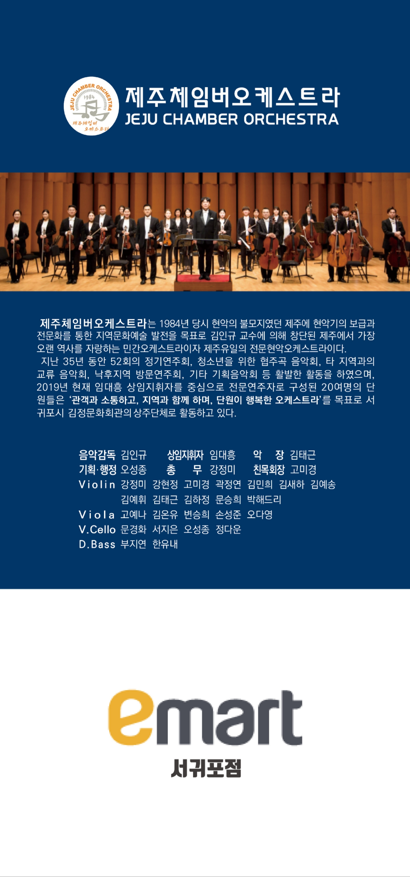 제주체임버오케스트라와 서귀포시 김정문화회관이 함께하는 2019 공연장상주단체 육성지원사업 '아하~ 클래식!' 마지막 공연에 여러분을 초대합니다.